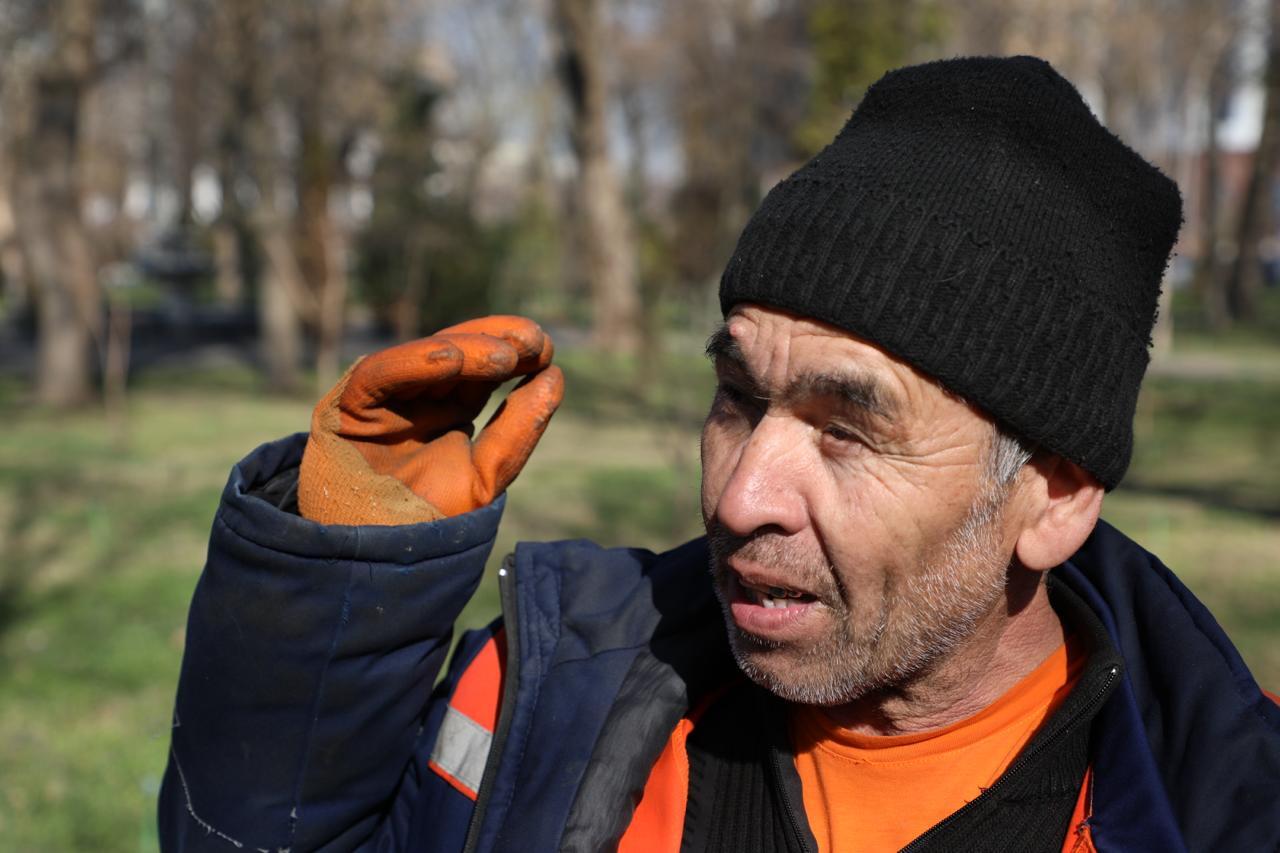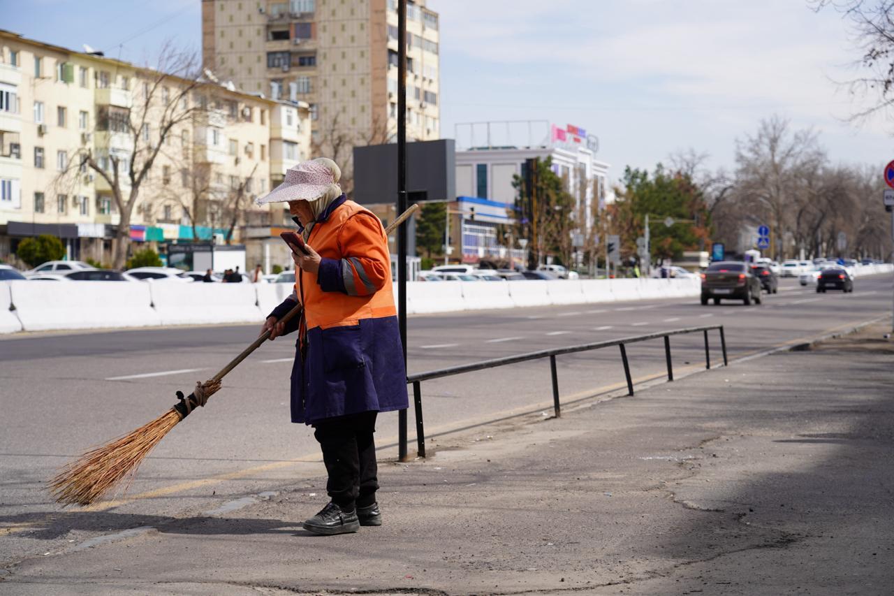 Утро у станции метро «Буюк ипак йули» в Ташкенте начинается со звука метлы по асфальту. Несколько человек в рабочих жилетах медленно проходят вдоль улицы, собирая в кучи листья и дорожную пыль.