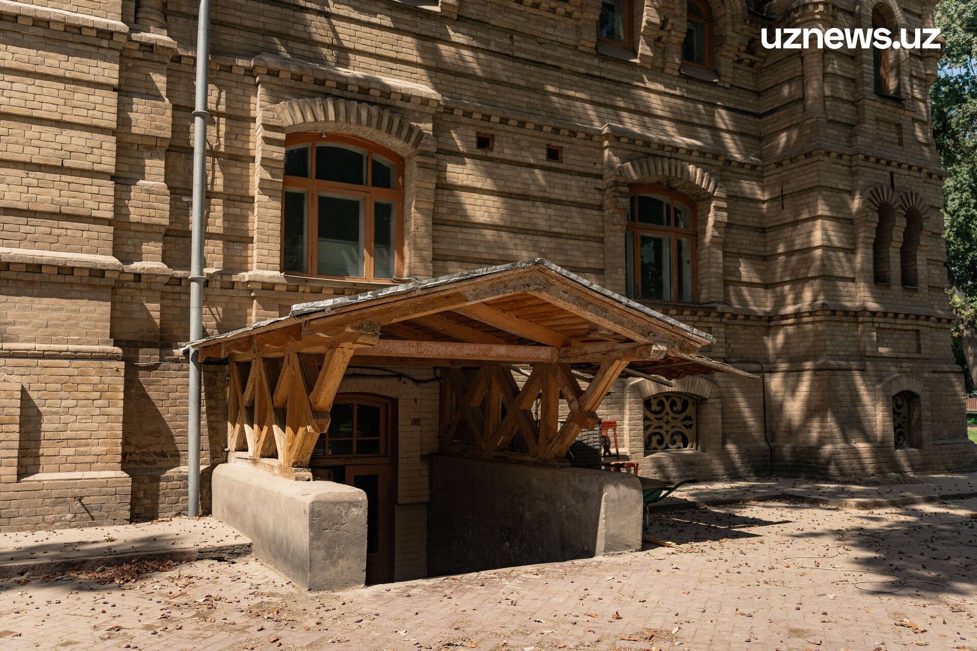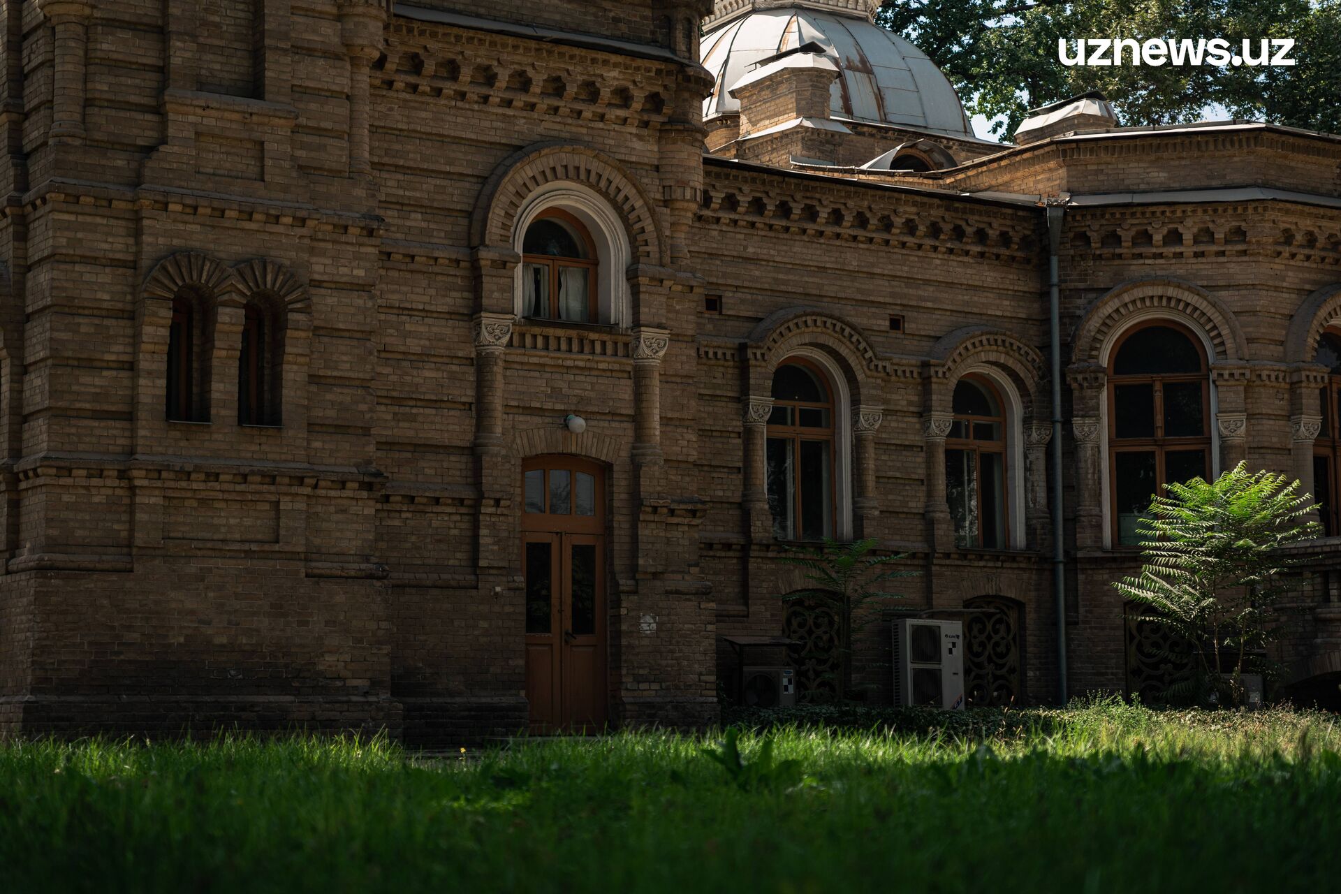 Дворец окружают огромные дубы и чинары, посаженные ещё в XIX веке. Перед главным входом – фонтан, который, к сожалению, сейчас не работает. На вершине фасада закреплён герб Узбекистана, совсем недавно в резиденции проводились приемы МИДа. Напоминанием, что здесь находилось министерство, служат многочисленные полотнища флагов разных стран, которые мы нашли в одной из комнат длинного тёмного подвала. Зайти в него можно как из дворцовых палат первого этажа, спустившись по лестнице, так и через вход с улицы.