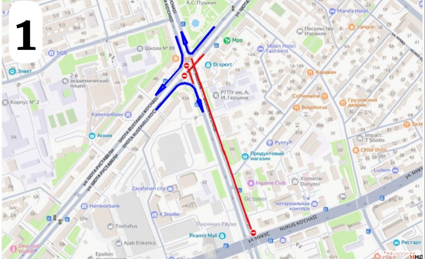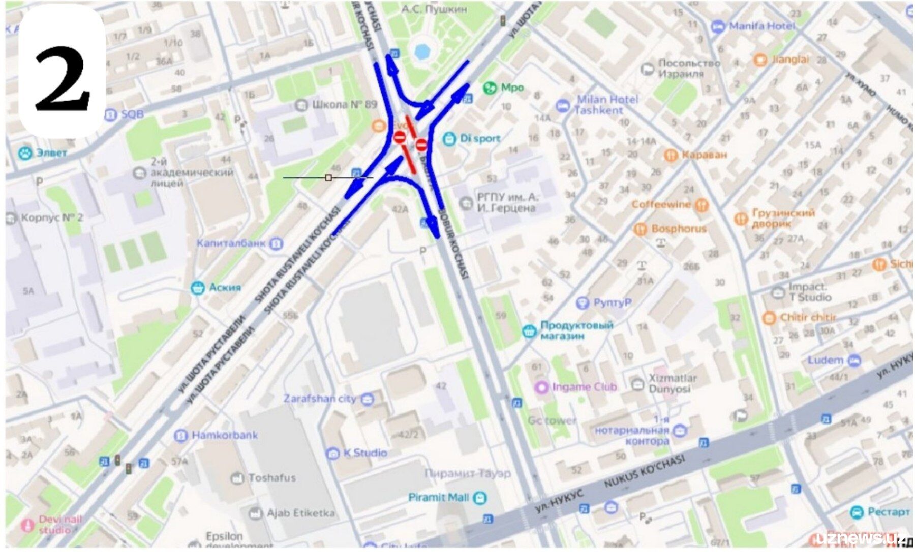 - при движении по улице Ш. Руставели будет запрещен поворот налево (разрешены проезд прямо и направо).