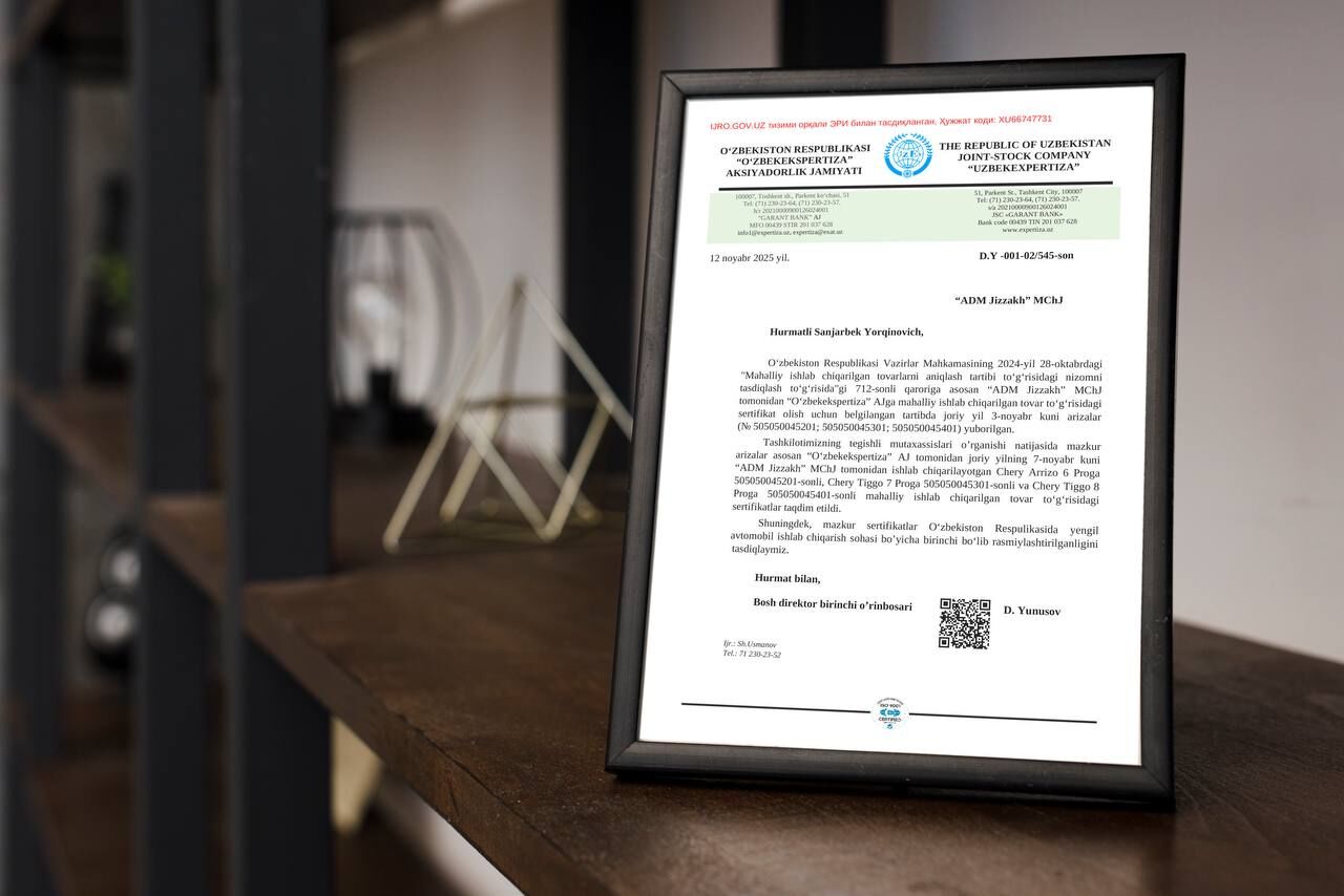 Теперь наличие официального сертификата позволяет государственным компаниям и организациям закупать автомобили ADM Jizzakh в соответствии с требованиями законодательства о местном производстве.
