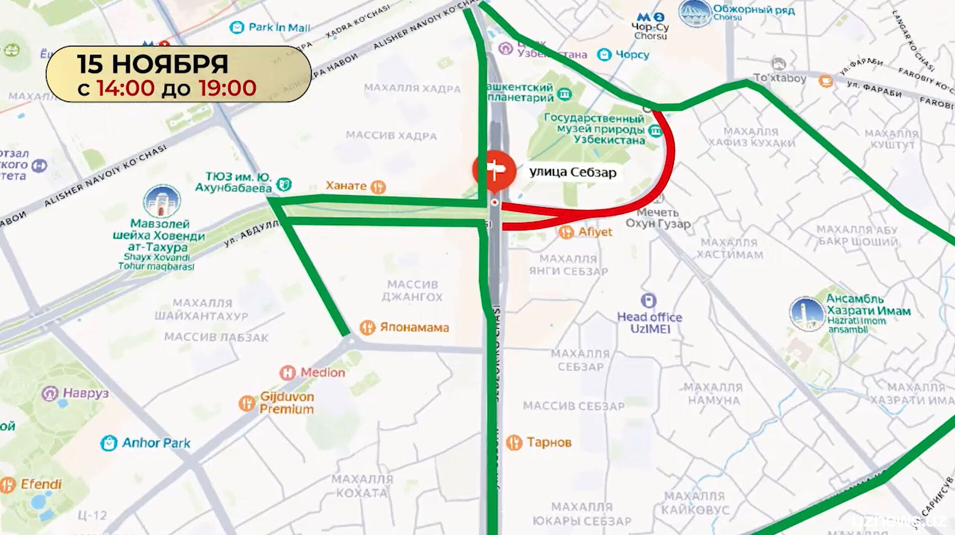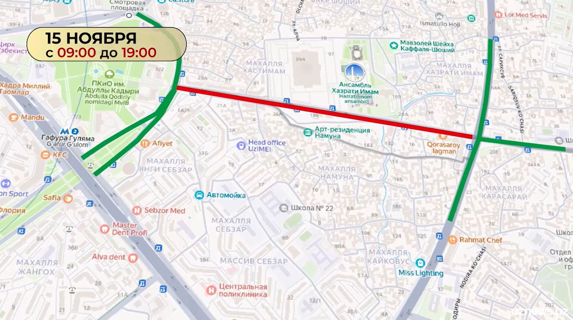 15 ноября с 09:00 до 19:00 будет закрыт участок от перекрёстка улиц Абдуллы Кадыри и Карасарай по улице Карасарай до пересечения улиц Нурафшан и Карасарай.