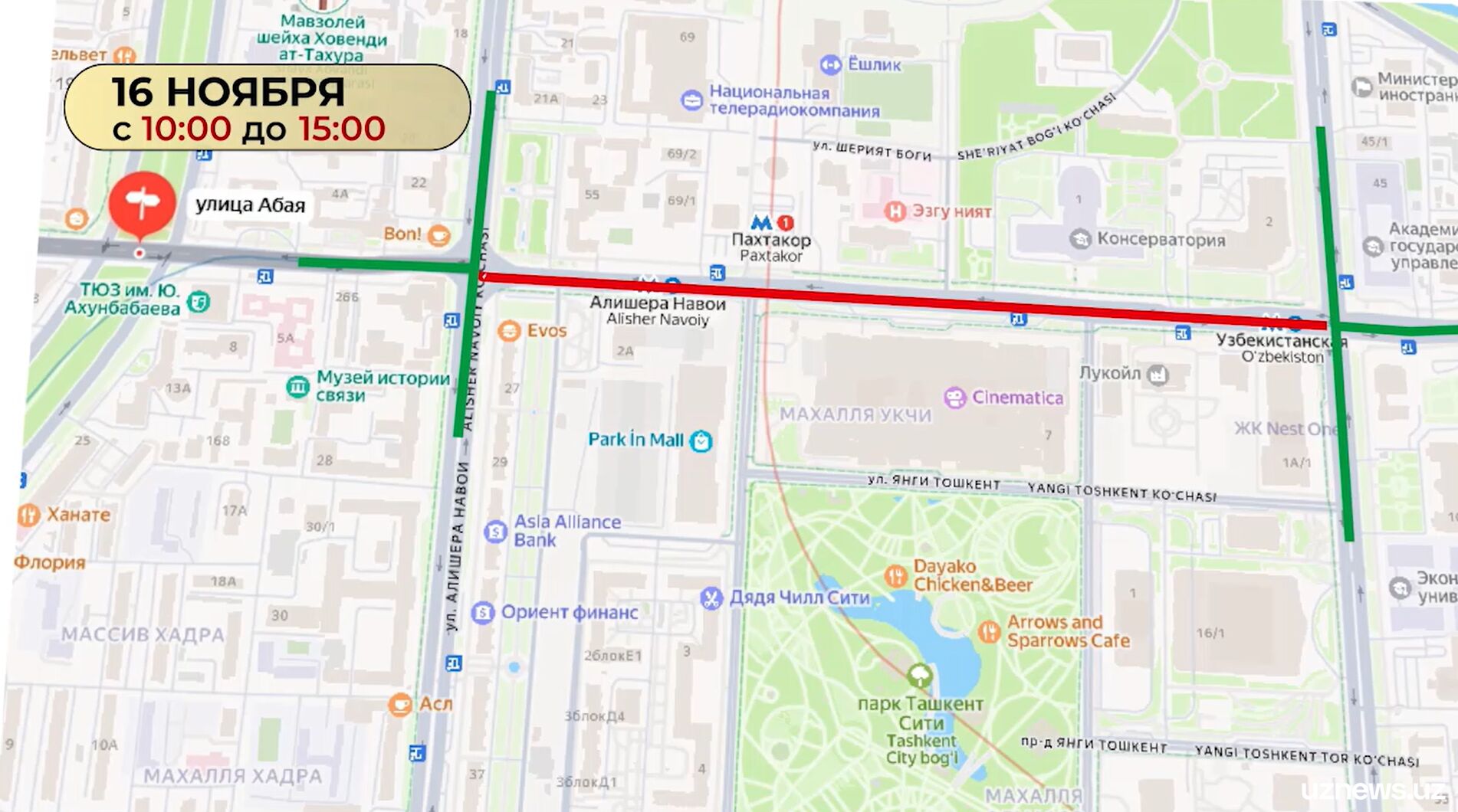 15 ноября с 14:00 до 19:00 будет закрыт участок от пересечения улиц Абдуллы Кадыри и моста «Ганги» до перекрёстка улиц Абдуллы Кадыри, Карасарай и Заркайнар.
