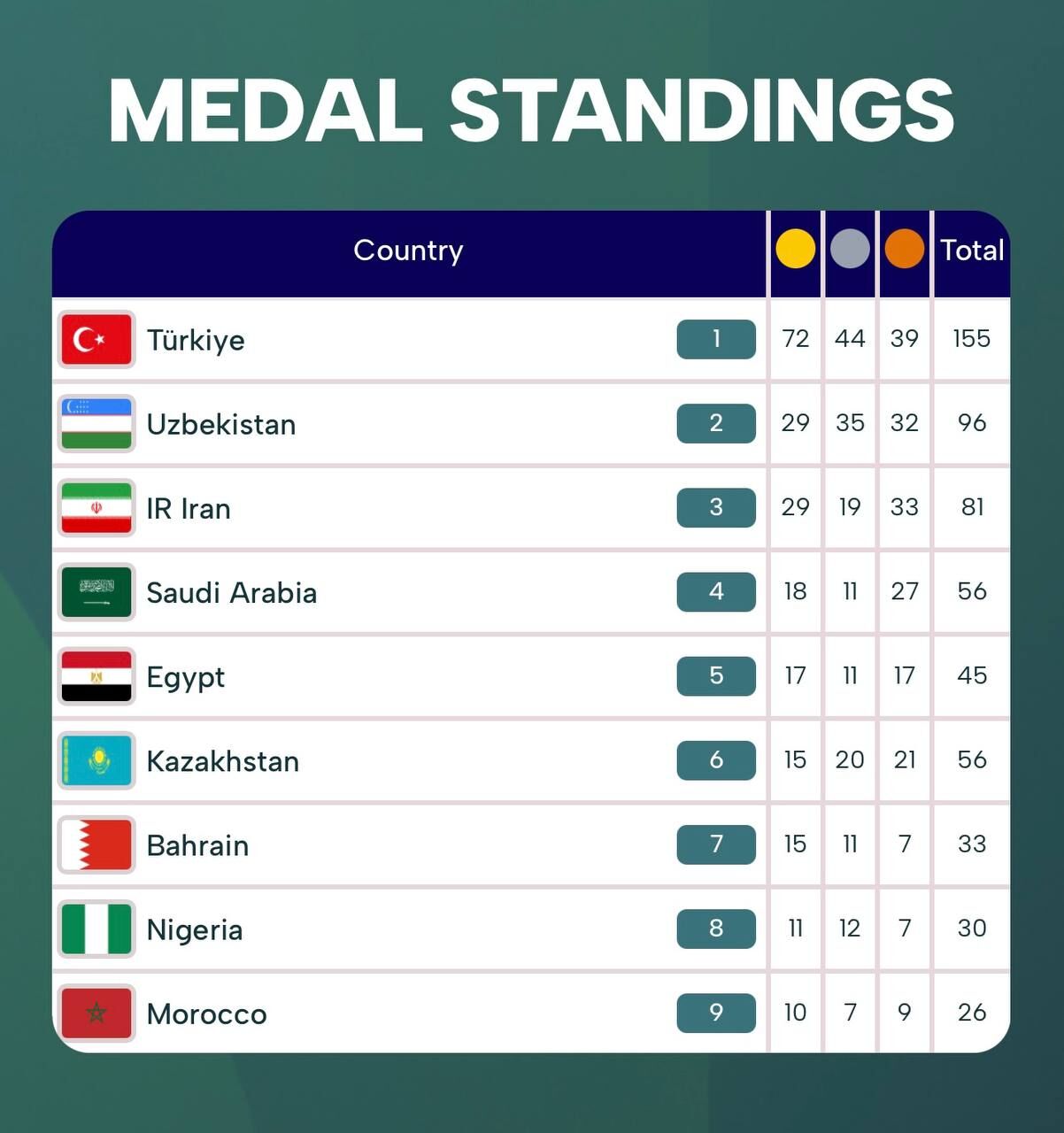По итогам соревнований Узбекистан занял второе место в общекомандном зачёте, завоевав 96 медалей: 29 золотых, 35 серебряных и 32 бронзовые.