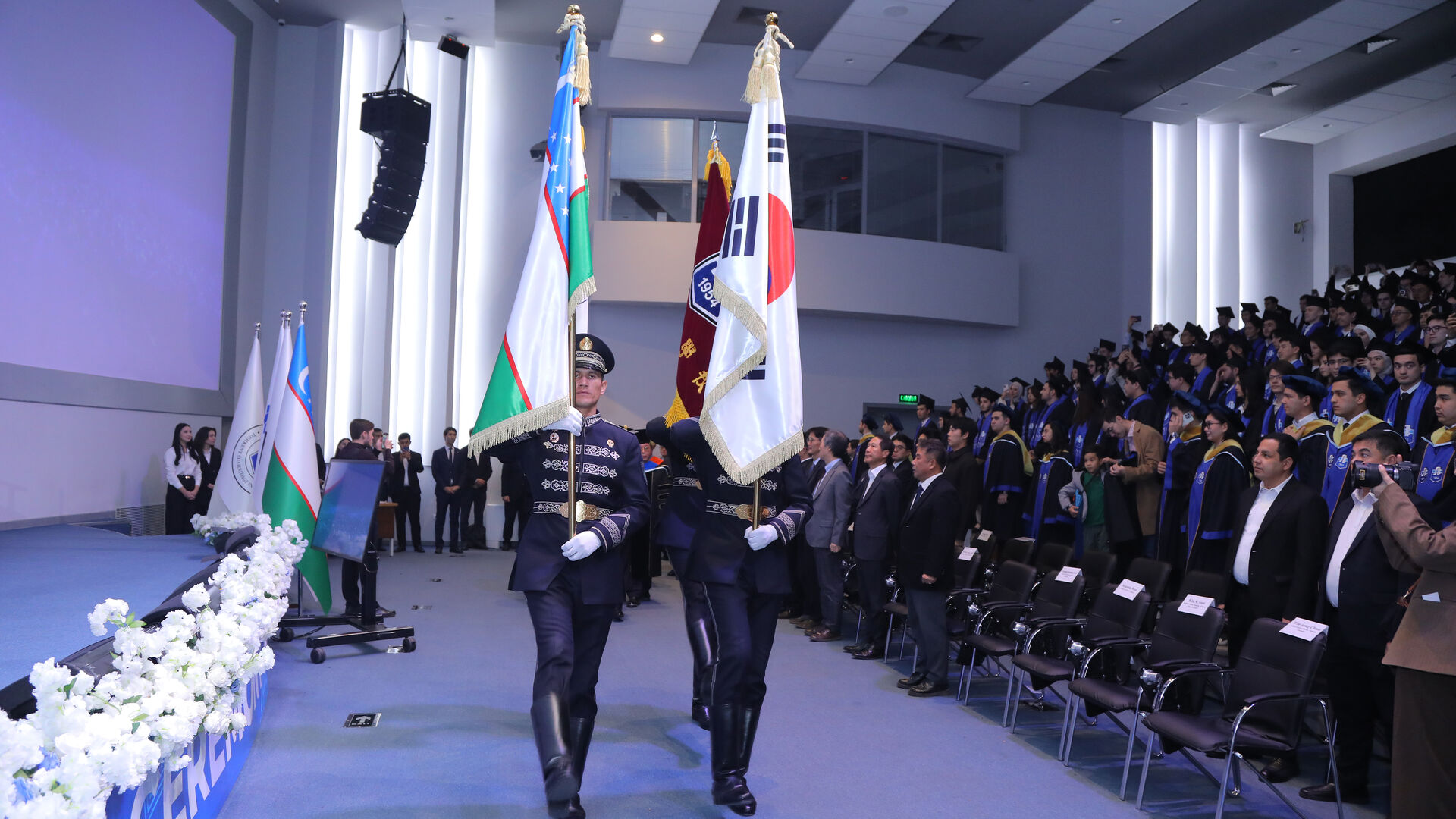 Церемония открылась триумфальным внесением государственных и университетских флагов. После минуты молчания в память о докторе Насире прозвучали гимны Узбекистана и Республики Корея.