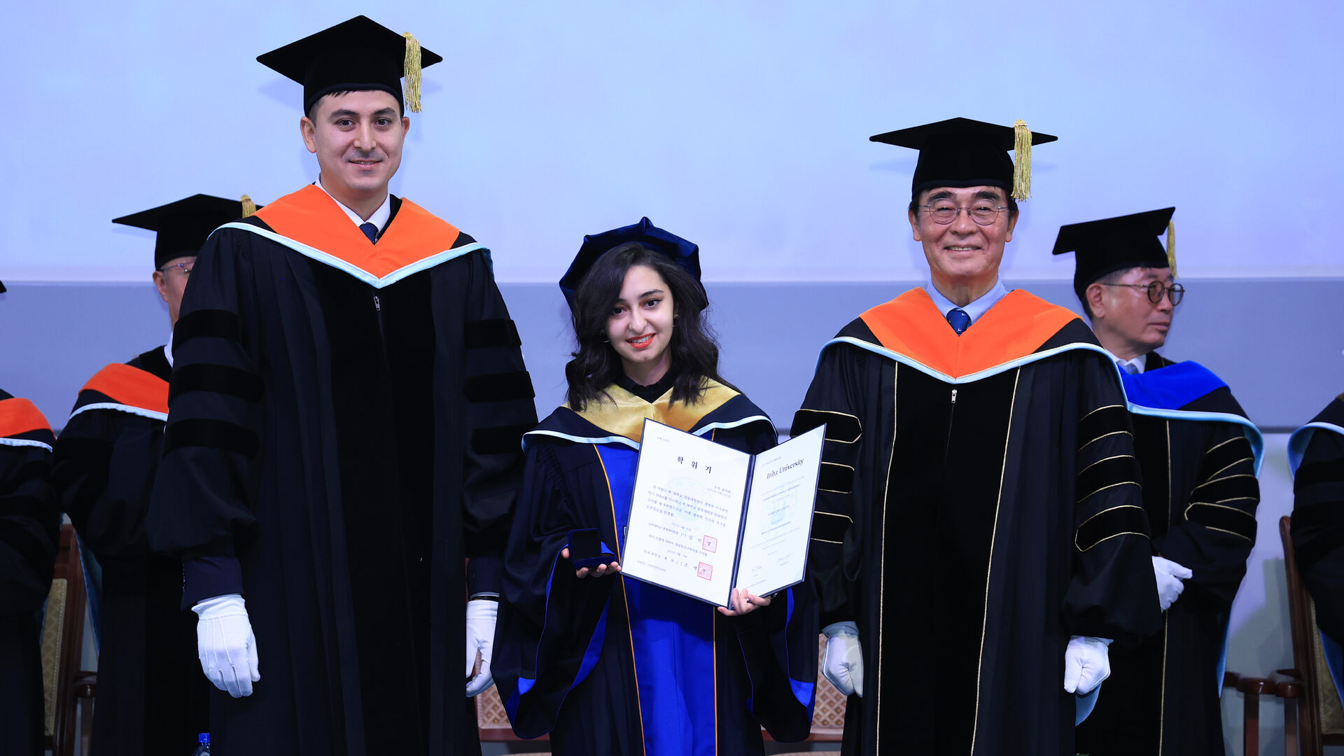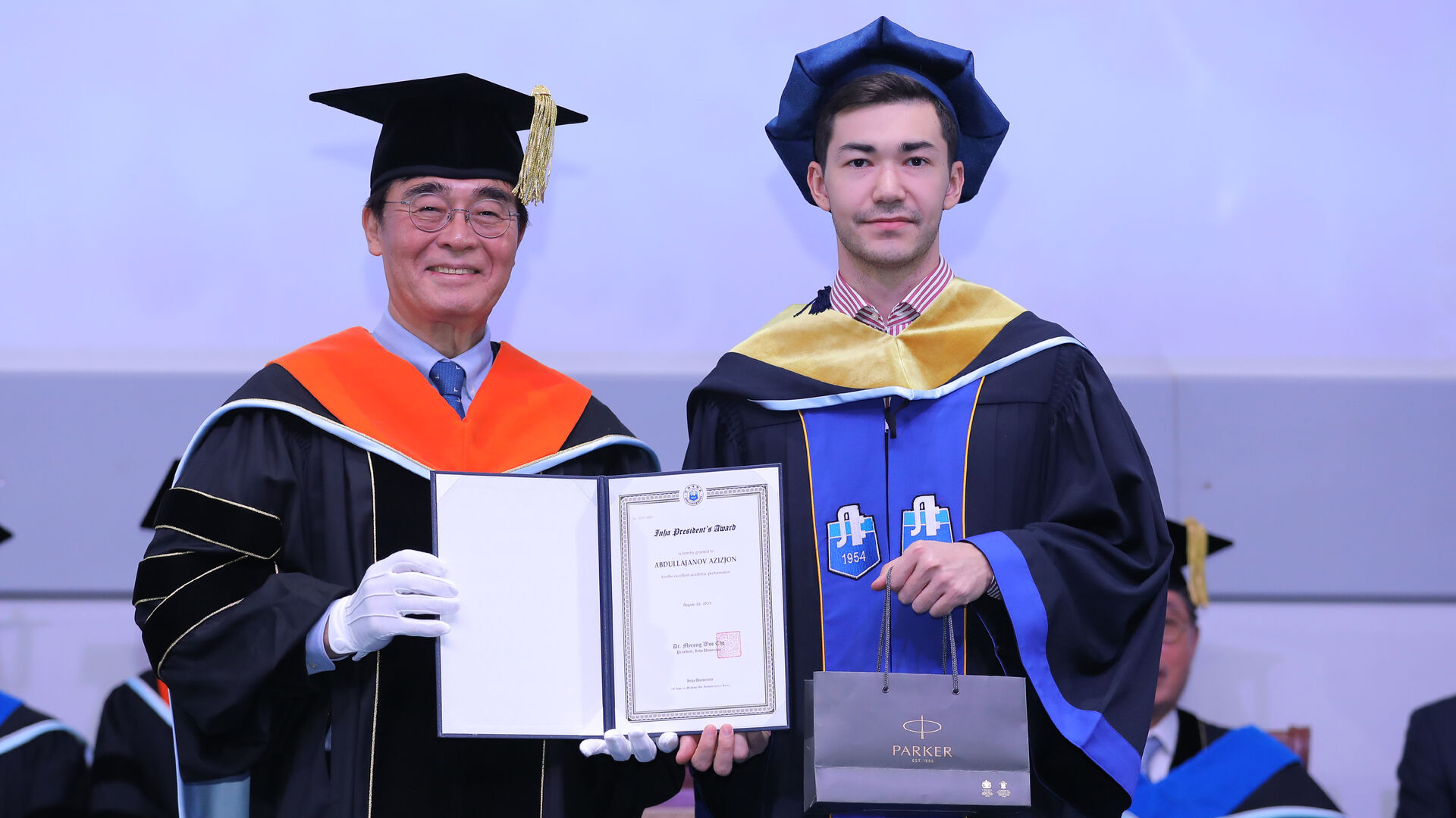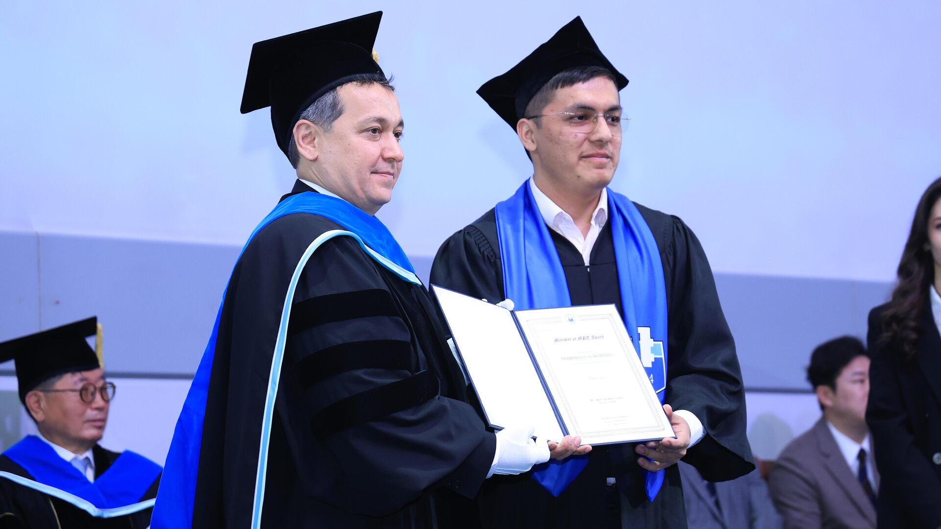 После этого состоялось главное событие дня — вручение дипломов. Каждый выпускник получил диплом из рук президента Университета ИНХА Чо Мён Ву, а также памятный подарок от ректора Бобура Абдуллаева. Завершилась церемония видеопосланием преподавателей, речью студента-представителя года и итоговой презентацией класса 2025. После официальной части выпускники и почётные гости сделали памятные фотографии.