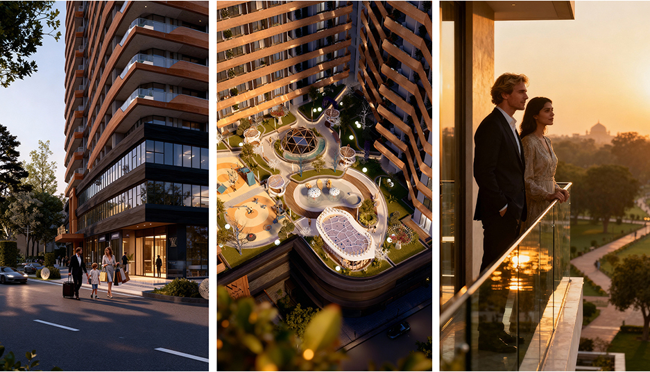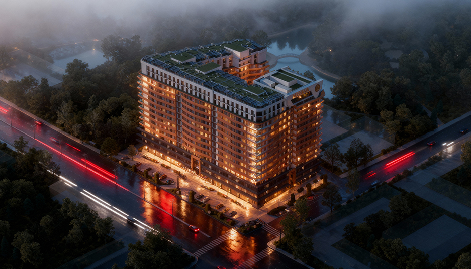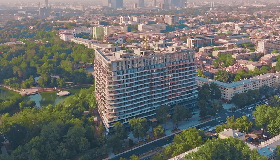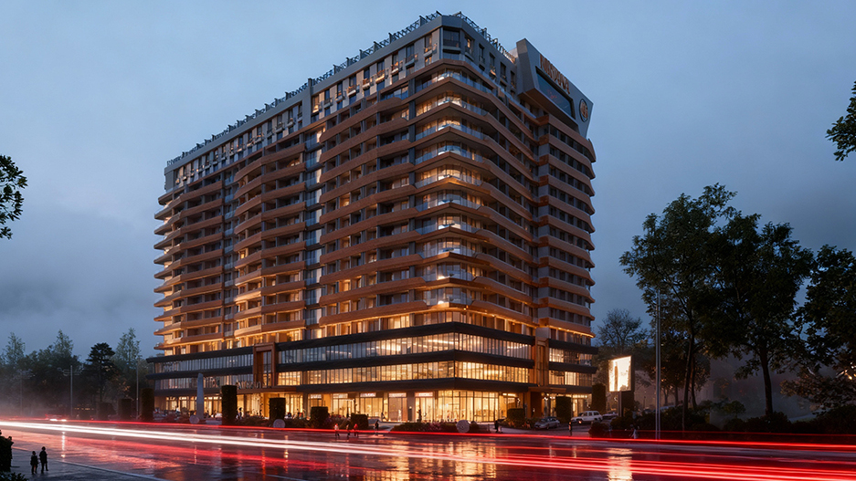 Здание комплекса поражает архитектурным размахом и элегантностью. 17-этажный проект, разработанный архитекторами мирового уровня, включает: