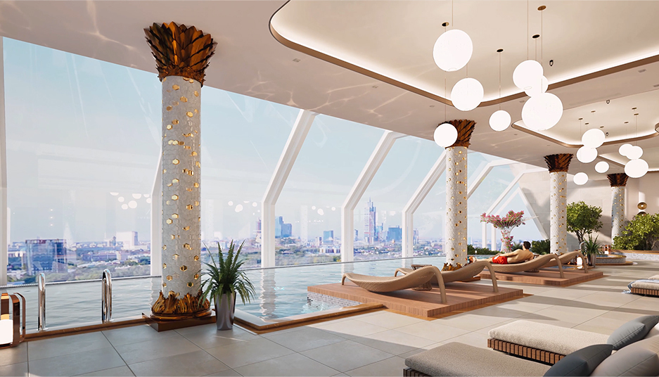 Инфинити-бассейн на крыше Nirvana Luxury Residence — на сегодняшний день самый большой среди жилых комплексов страны. Недавно завершена установка крышной конструкции-витрины над бассейном, которая будет использоваться в холодный сезон.