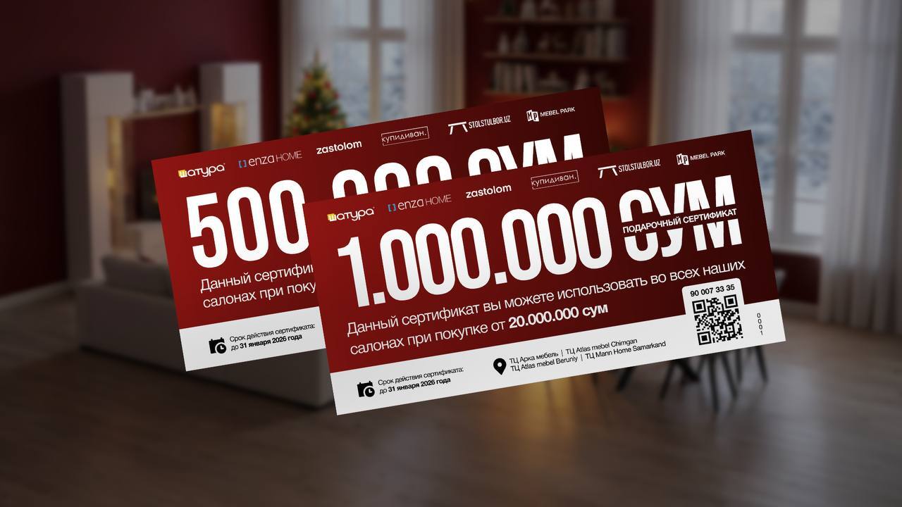 В декабре покупатели мебельных салонов Mann Home получают два подарочных сертификата на общую сумму 1 500 000 сумов. Их можно использовать как дополнительную скидку при следующей покупке или передать друзьям и родственникам.