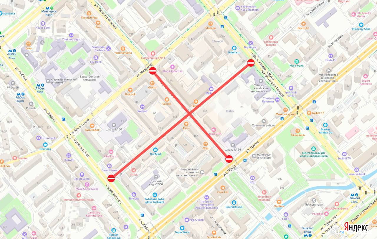 — участок улицы Буюк Турон от пересечения с улицей Истиклол до Дворца творчества молодежи.