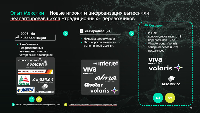 В качестве примера такого «опережающего рывка» эксперты приводят трансформацию авиационного рынка Мексики, где после либерализации и цифровизации пассажиропоток за 20 лет вырос почти втрое, а рынок консолидировался вокруг нескольких эффективных игроков с сильным фокусом на цифровые каналы.
