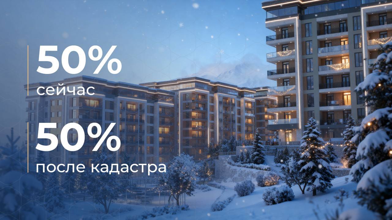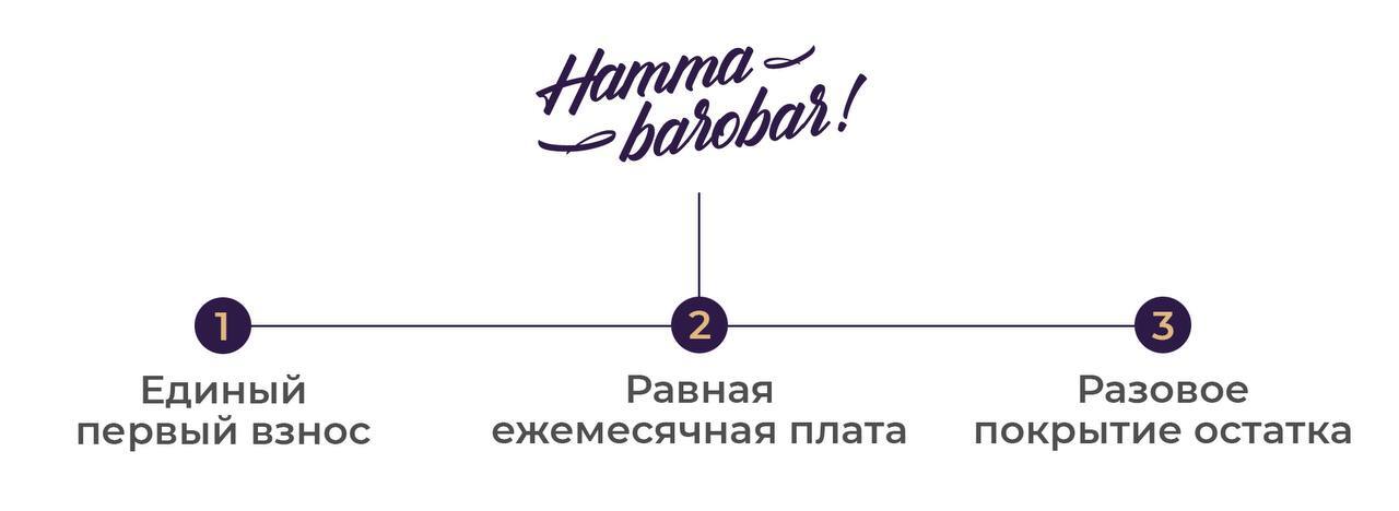 «50/50» — вариант оплаты в рамках предложения «Hamma Barobar», действует на апартаменты во всех фазах. 50% от стоимости апартамента вносится при заключении договора, а оставшиеся 50% — после получения кадастра.