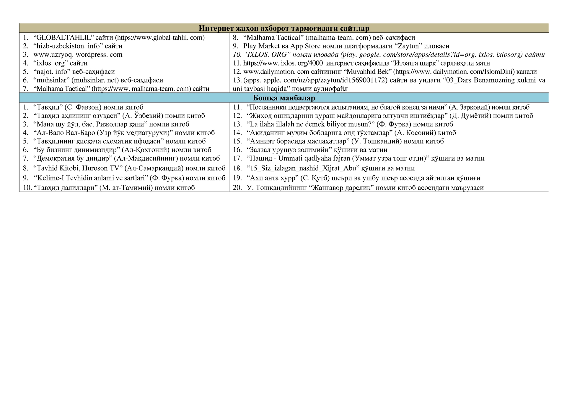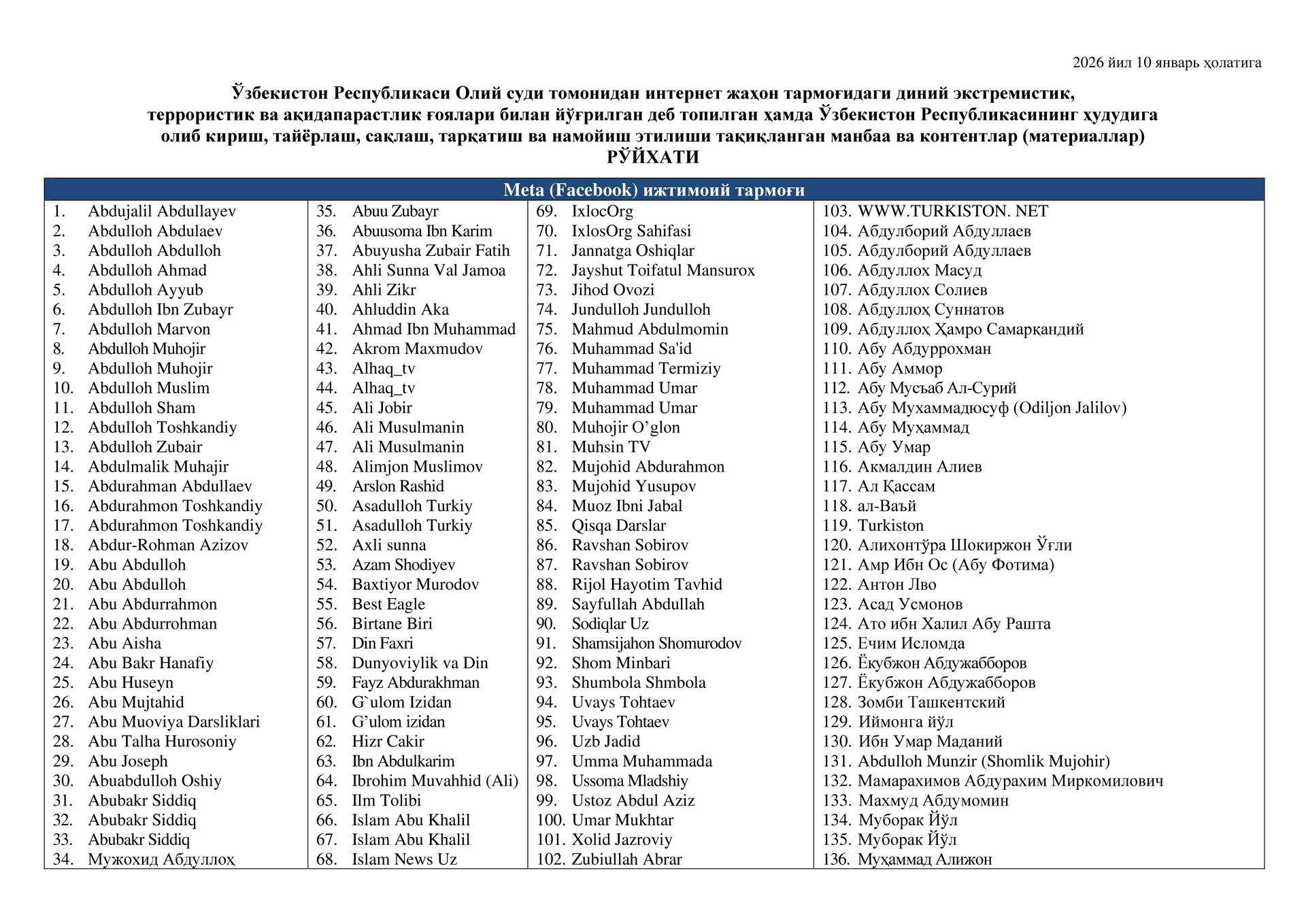 Верховный суд опубликовал обновлённый список запрещённых к ввозу, изготовлению, распространению и показу на территории Узбекистана материалов, которые связаны с идеями экстремизма и терроризма.