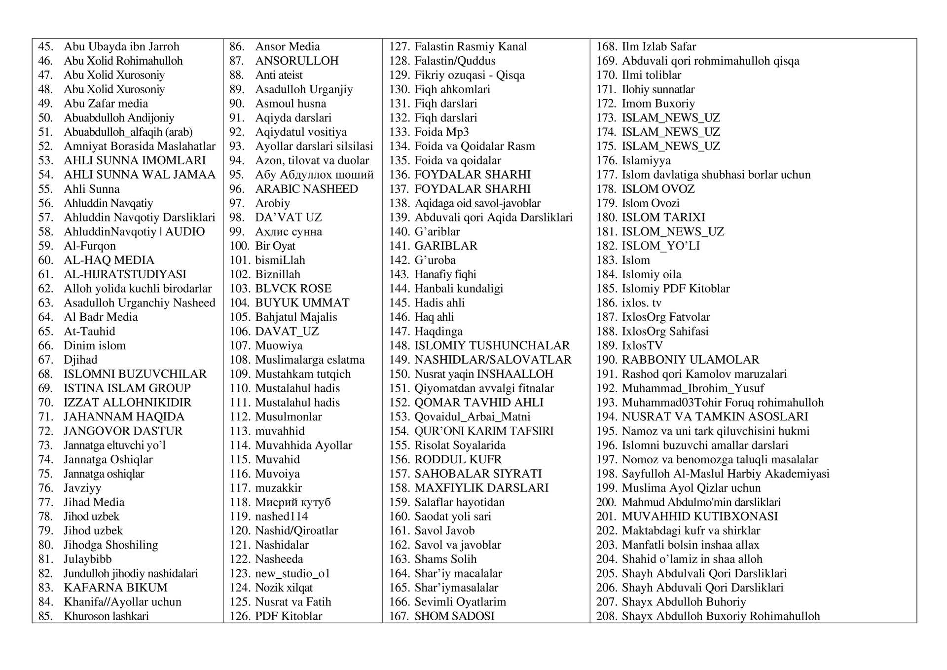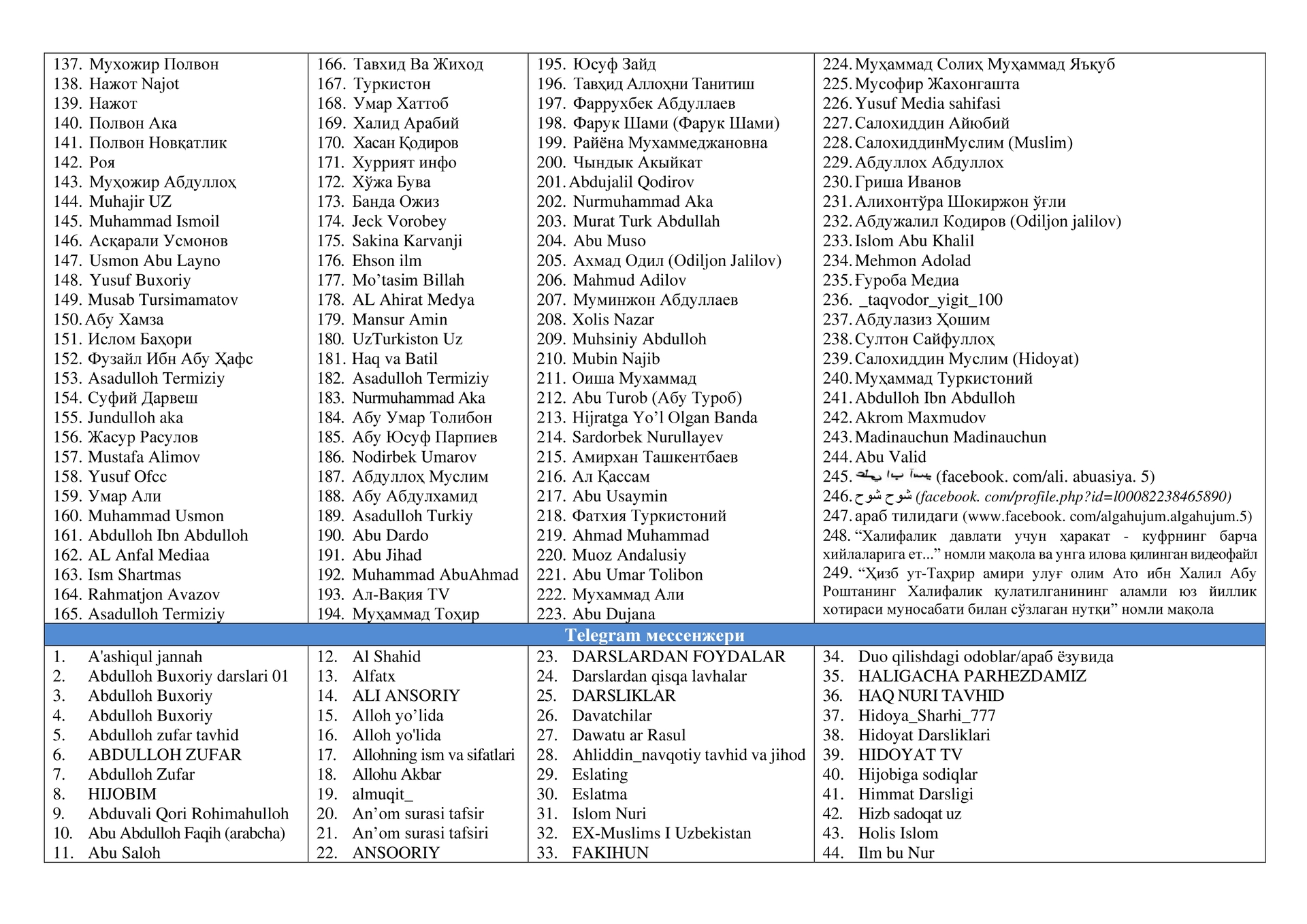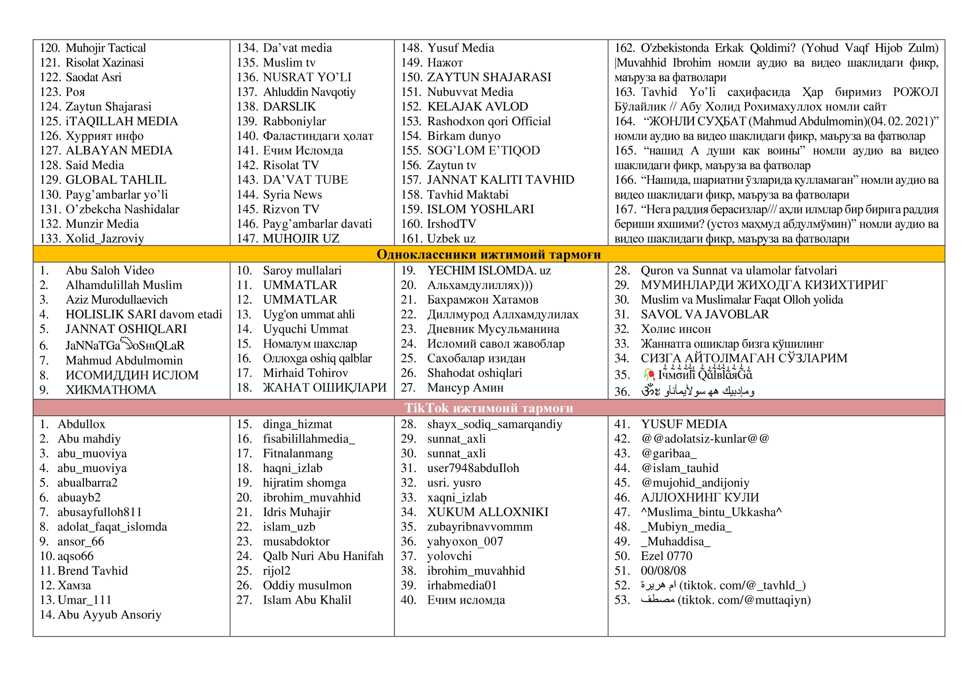 В перечень включены 249 страниц на Facebook, 790 каналов и групп в мессенджере Telegram, 265 профилей в Instagram, 167 каналов на Youtube, 36 страниц в «Одноклассниках», 53 аккаунта в TikTok, 33 веб-сайта и других источников с запрещёнными материалами.