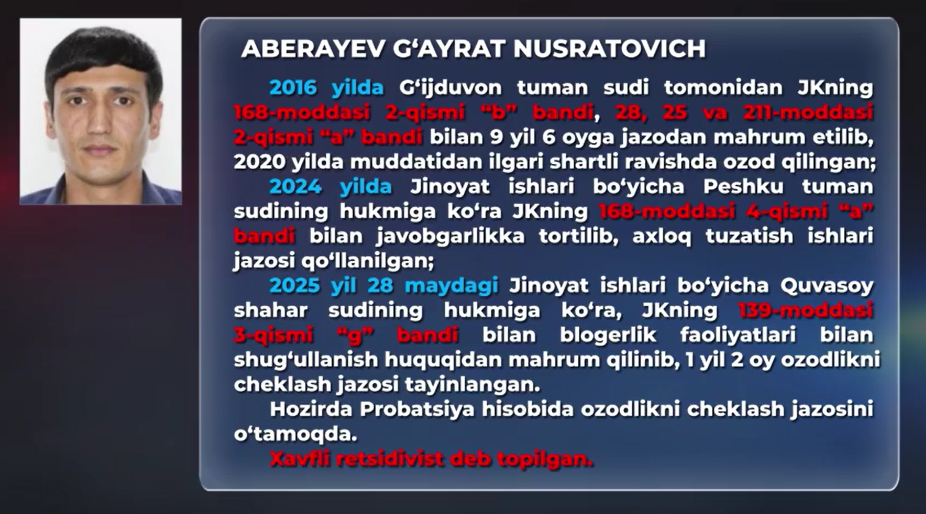 Несмотря на наказание в виде исправительных работ (2024 год) и ограничение свободы с запретом на блогерскую деятельность (май 2025 года), Абераев продолжил преступную деятельность. Для обхода судебного запрета на использование интернета он создал фейковый аккаунт на имя своего брата, Ганишера Абераева, через который координировал информационные атаки на бизнес.