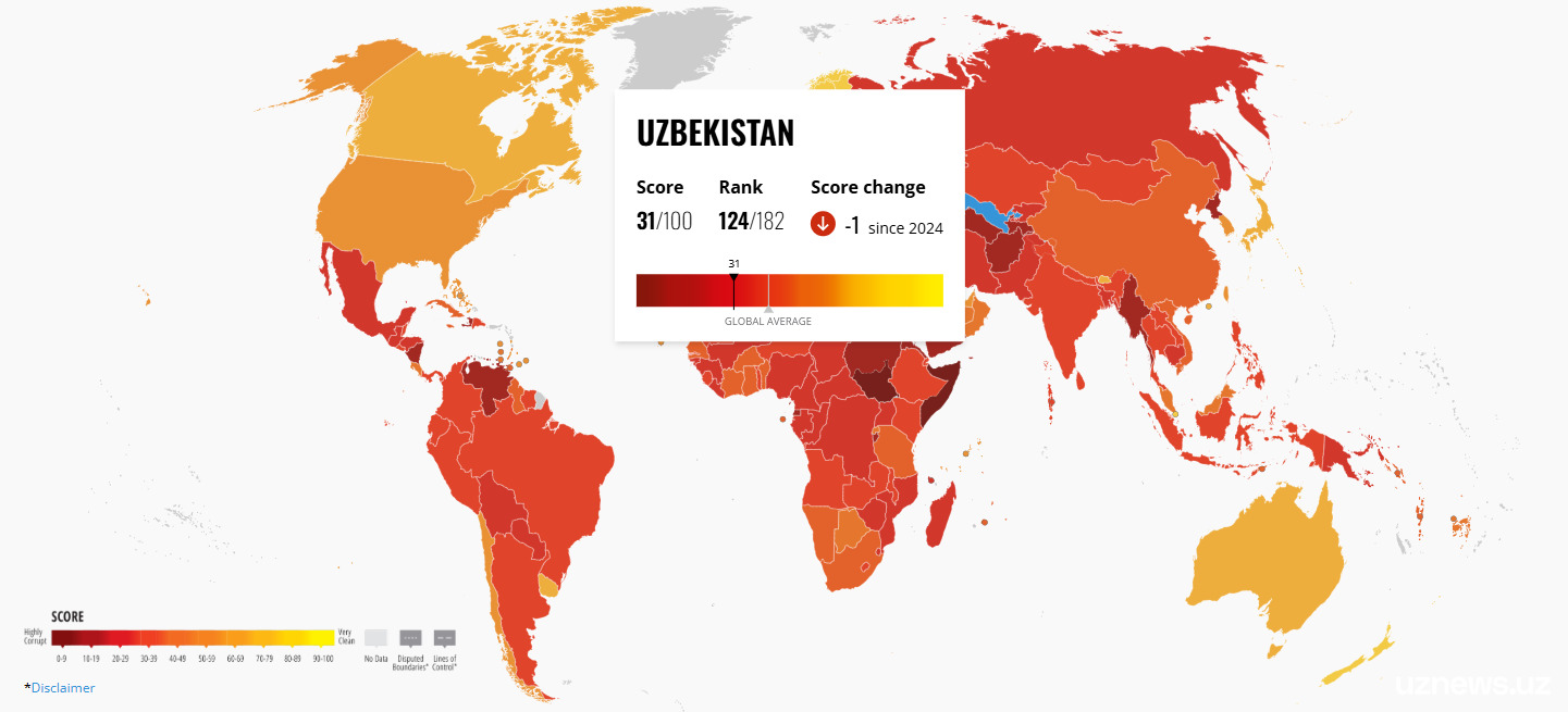 По итогам прошлого года Узбекистан ухудшил свои позиции в индексе восприятия коррупции, расположившись на 124-е место из 182. Это следует из отчета международной организации Transparency International, посвященном ситуации с коррупцией в мире в 2025 году.