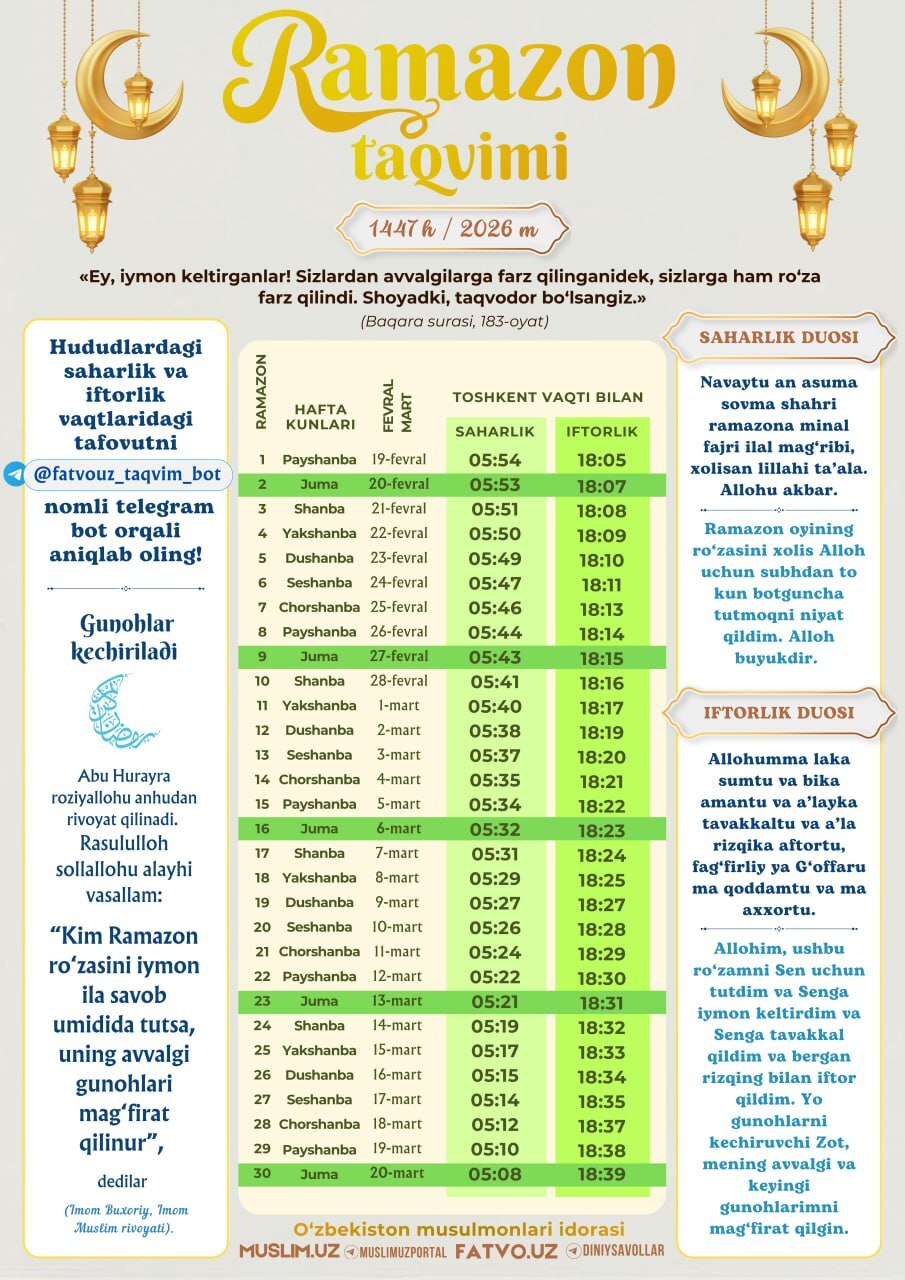 Управление мусульман Узбекистана опубликовало время сухура и ифтара для священного месяца Рамазан для жителей Ташкента и других городов.