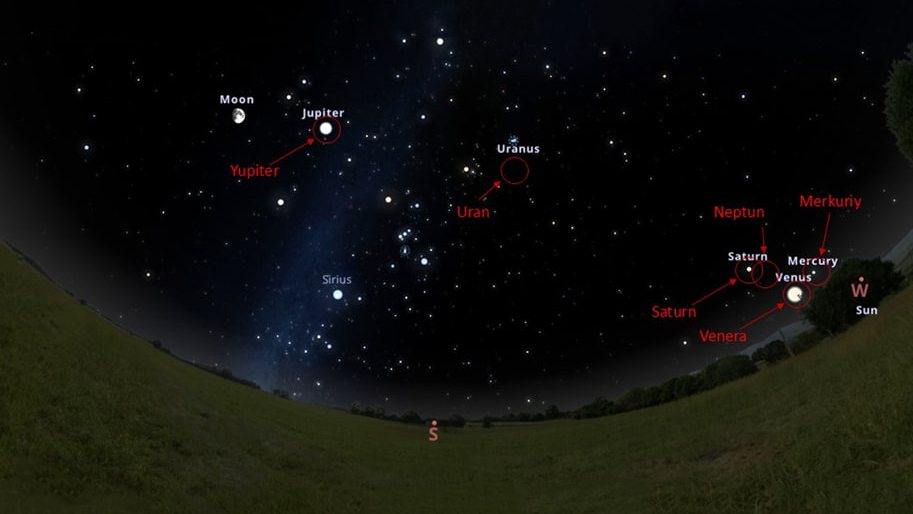 «Наблюдать это явление можно будет по всей территории нашей страны после захода Солнца. Планеты займут примерно четверть небесной сферы, и искать их нужно в юго-западной части неба. Из шести планет четыре можно будет увидеть невооружённым глазом — это Меркурий, Венера, Сатурн и Юпитер. Нептун и Уран из-за своей слабой яркости потребуют использования оптических приборов (телескопа или бинокля)», - рассказали учёные.