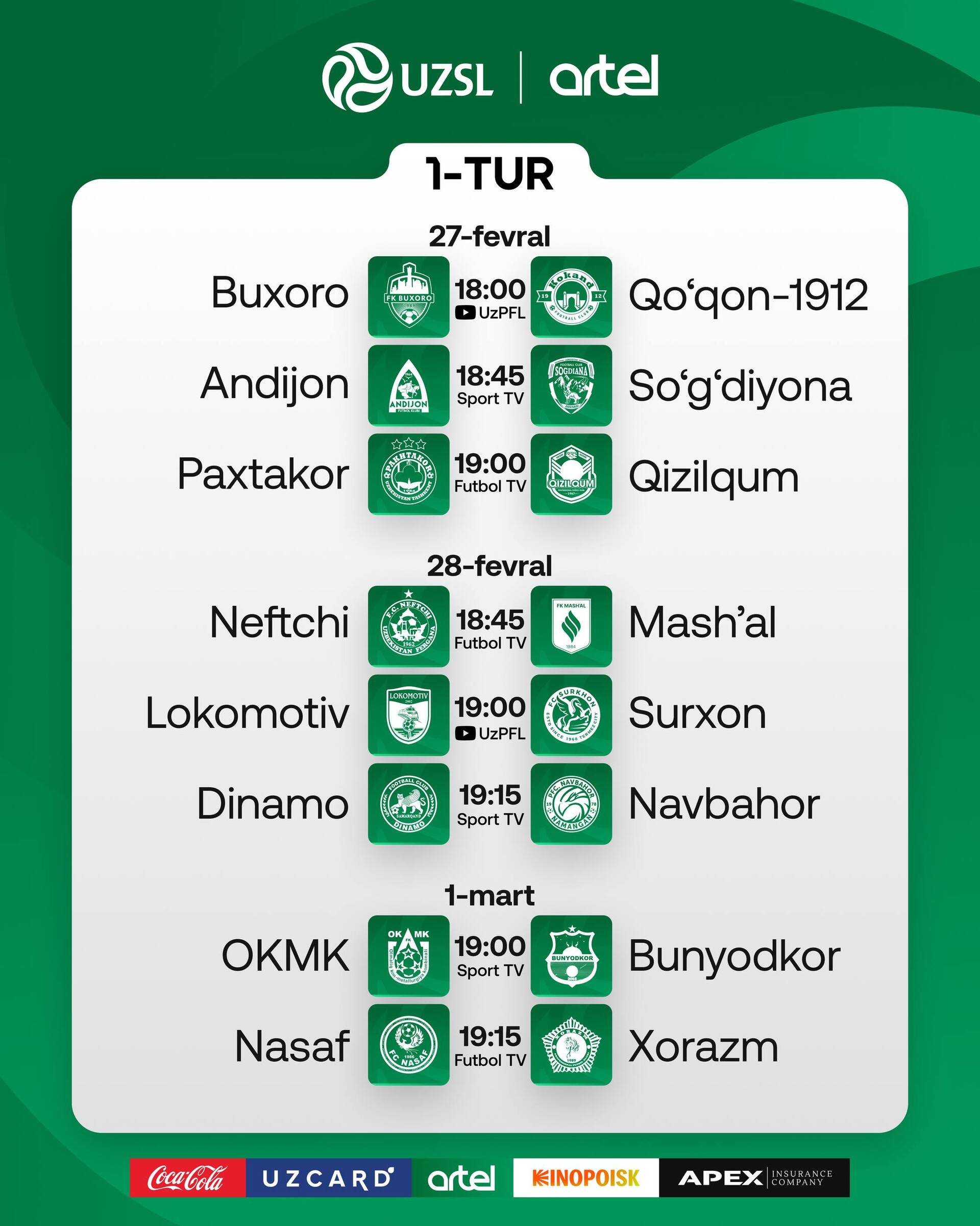 Первая игра пройдёт на стадионе Ассоциации футбола Бухары, где «Бухара» примет «Коканд-1912». Начало матча — в 18:00.