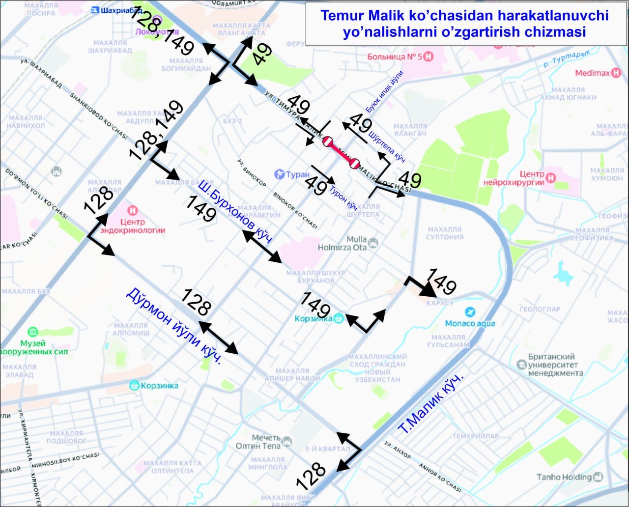 — автобусный маршрут №49 в направлении ТТЗ будет следовать по улицам: Темура Малика — Султония — Шортепа-2 — Шортепа — Темура Малика;