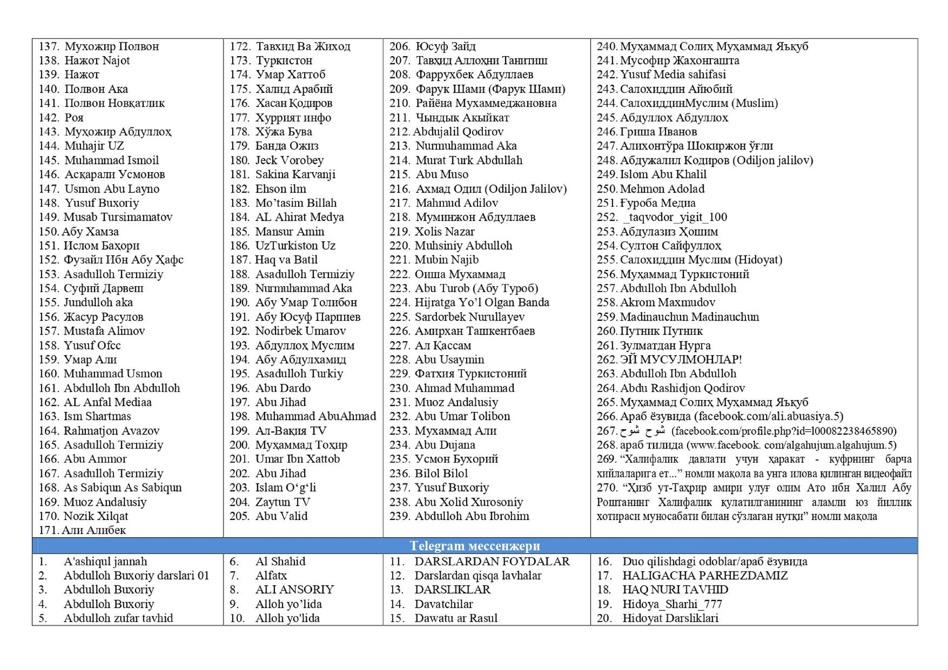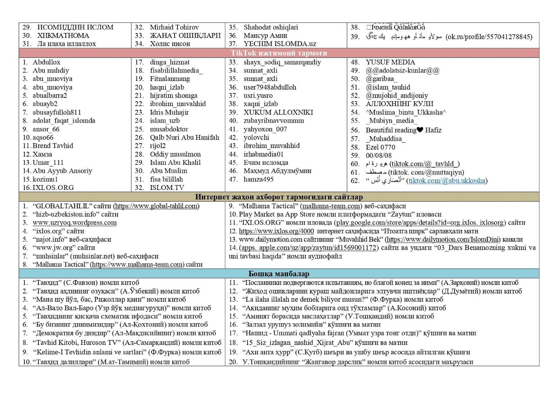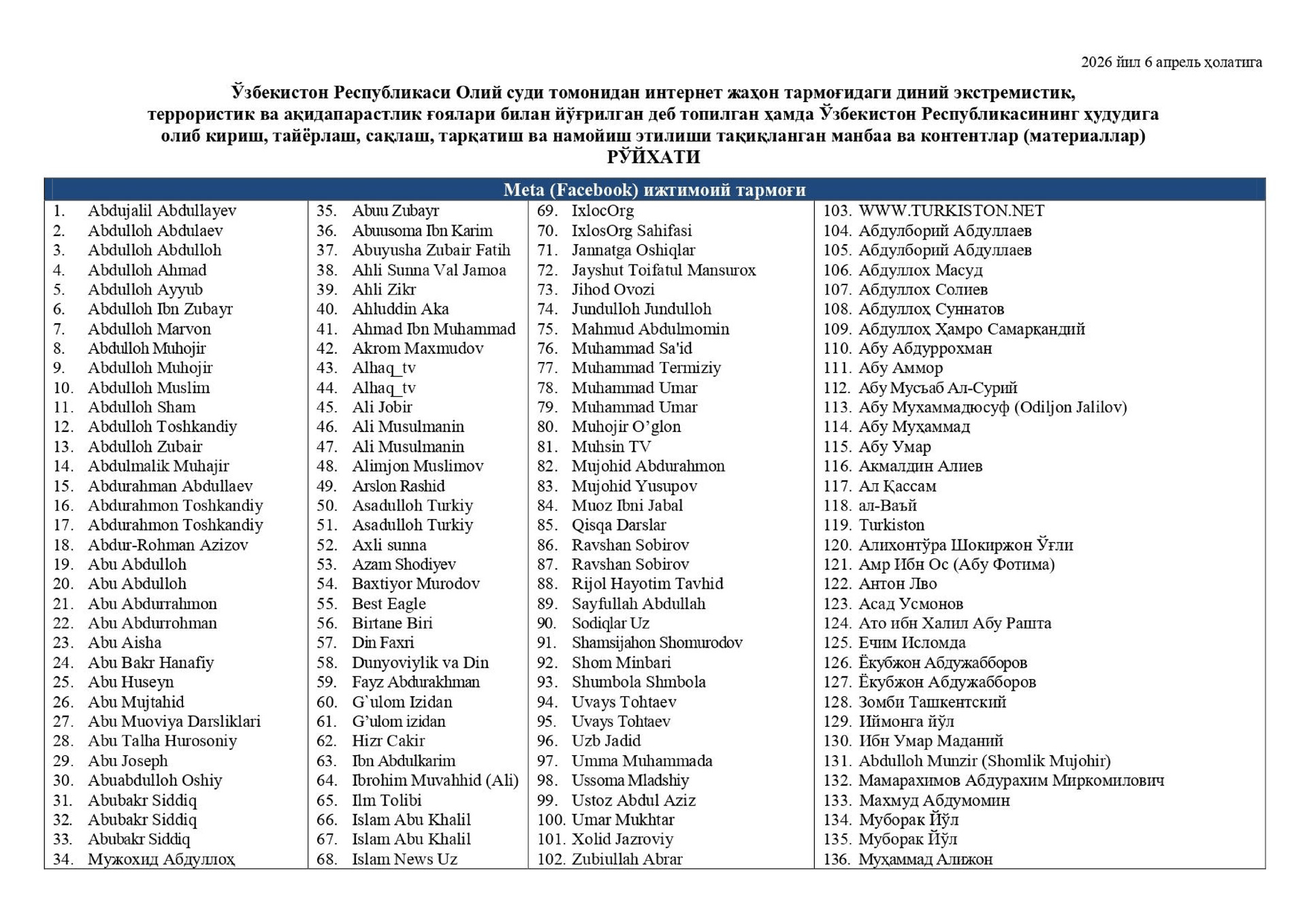 Верховный суд опубликовал обновлённый список запрещённых к ввозу, изготовлению, распространению и показу на территории Узбекистана материалов, которые связаны с идеями экстремизма и терроризма.