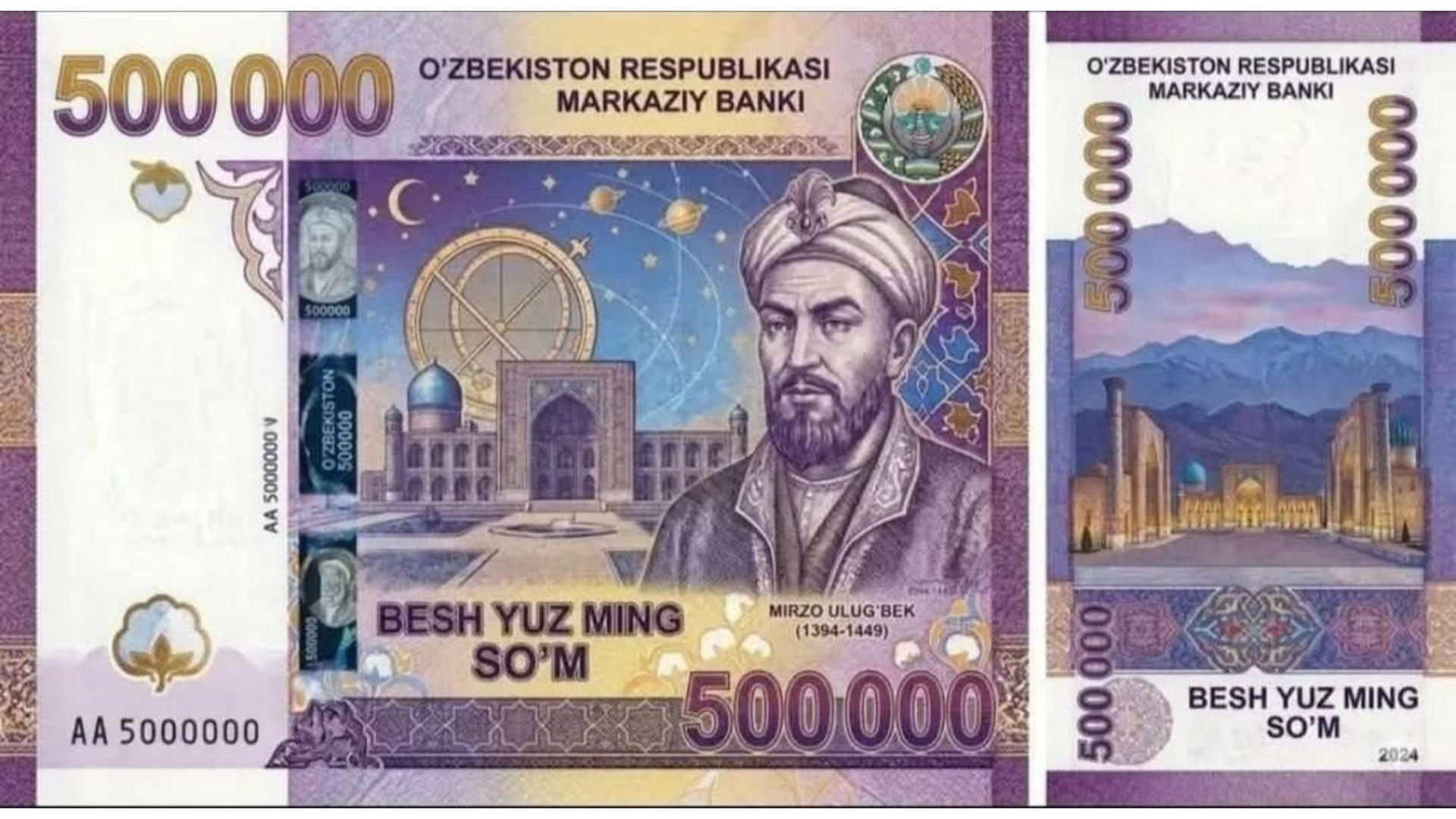 В социальных сетях распространилось изображение купюры номиналом 500 000 сумов, которую якобы в скором времени планируется ввести в обращение. Дизайн банкноты выполнен в стилистике эпохи Мирзо Улугбека.