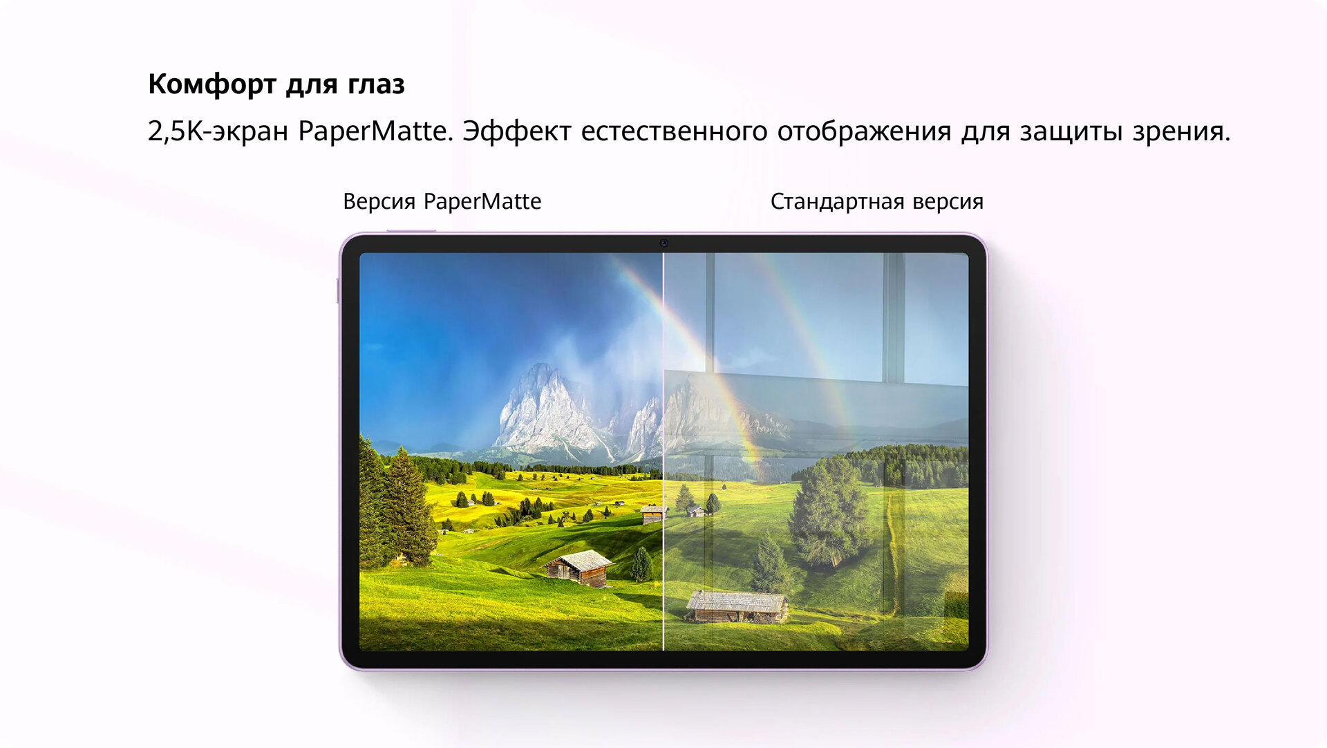 Главной особенностью MatePad является дисплей PaperMatte, достигнутый благодаря наногравировке и магнетронному нанооптическому покрытию. Это обеспечивает превосходные антибликовые и антирефлексные свойства, позволяя чётко видеть экран даже при ярком солнечном свете или в хорошо освещённых офисах. Наногравировка создаёт особую текстуру поверхности, имитируя ощущение письма на бумаге. Стилус HUAWEI M-Pencil (3-го поколения) идеально работает с планшетом, обеспечивая плавное и естественное рукописное письмо. Дополнительно реализованы функции защиты зрения, такие как круговая поляризация и DC-димминг, для комфортного использования.