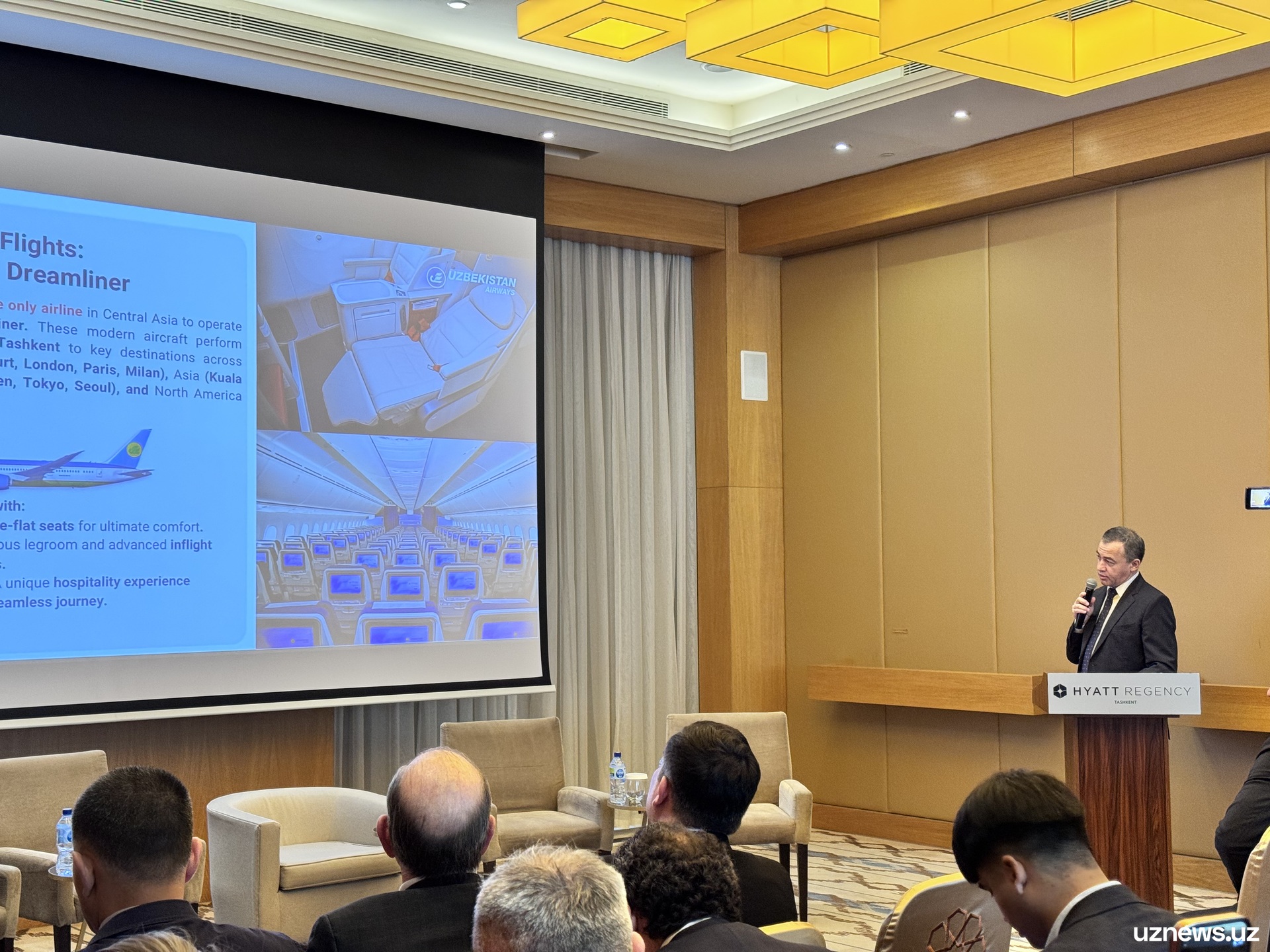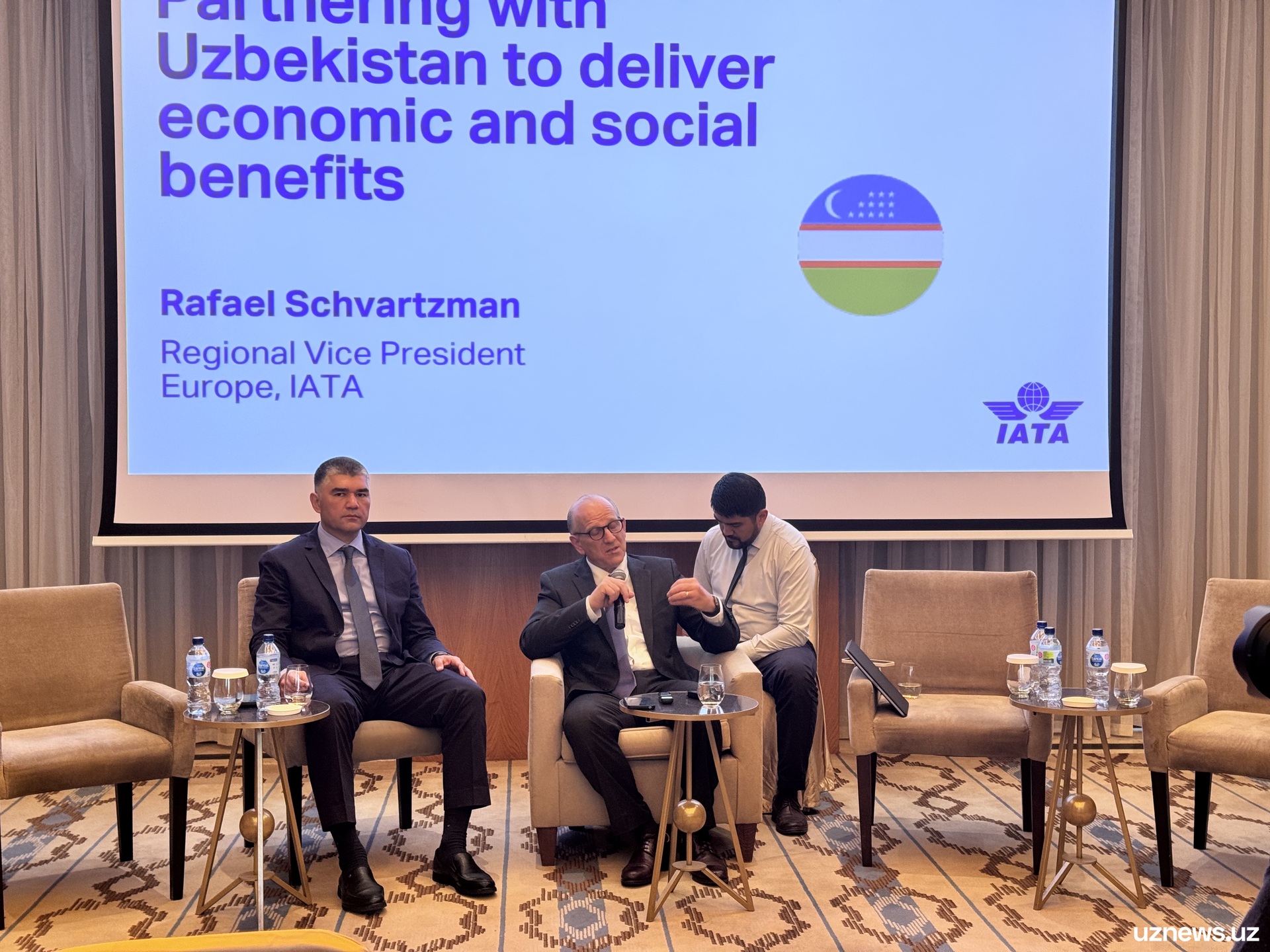 В мероприятии приняли участие министр транспорта Илхом Махкамов и региональный вице-президент IATA по Европе Рафаэль Шварцман.