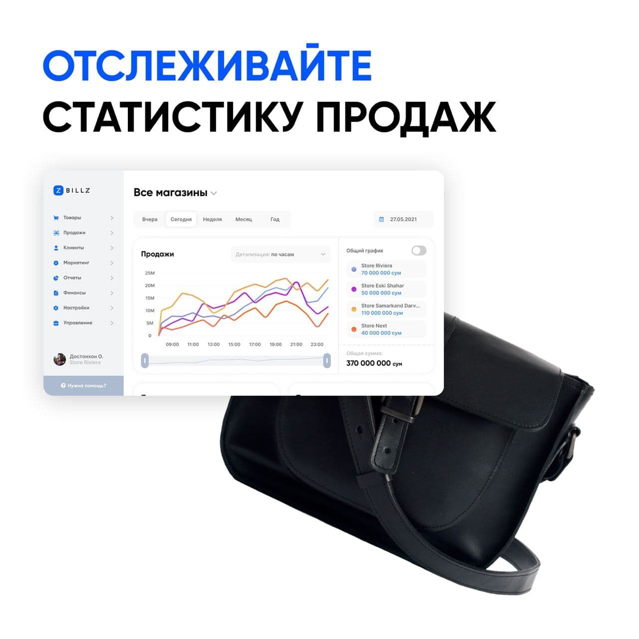 ‐ Просматривать выручку, продажи товаров и остатки в магазинах онлайн