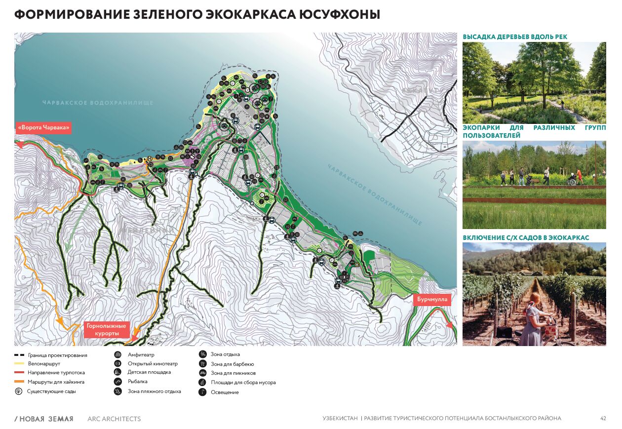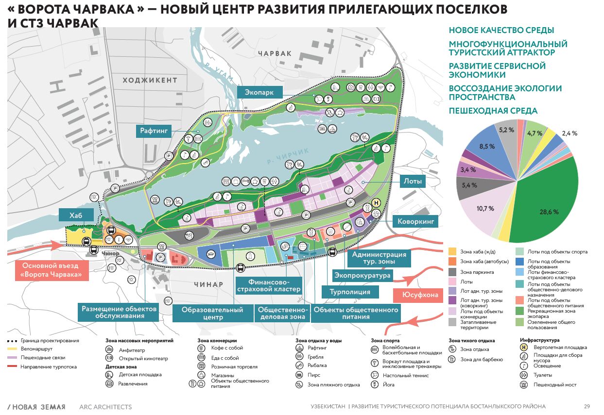 В рамках проводимой работы были разработаны мастер-планы и концепции развития двух пилотных территорий в составе ТРЗ «Чарвак»: «Чорвок дарвозаси. Жанубий Ходжикент» («Врата Чарвака: Южный Ходжикент») и «Юсуфхона». Проектирование территорий и архитектурных решений осуществлялось консорциумом проектно-консалтинговой компании «Новая Земля» (Россия), архитектурным бюро ARC (Узбекистан) и ГУП Института «ТошбошпланЛИТИ» по части адаптации мастер-планов в проекты детальной планировки.