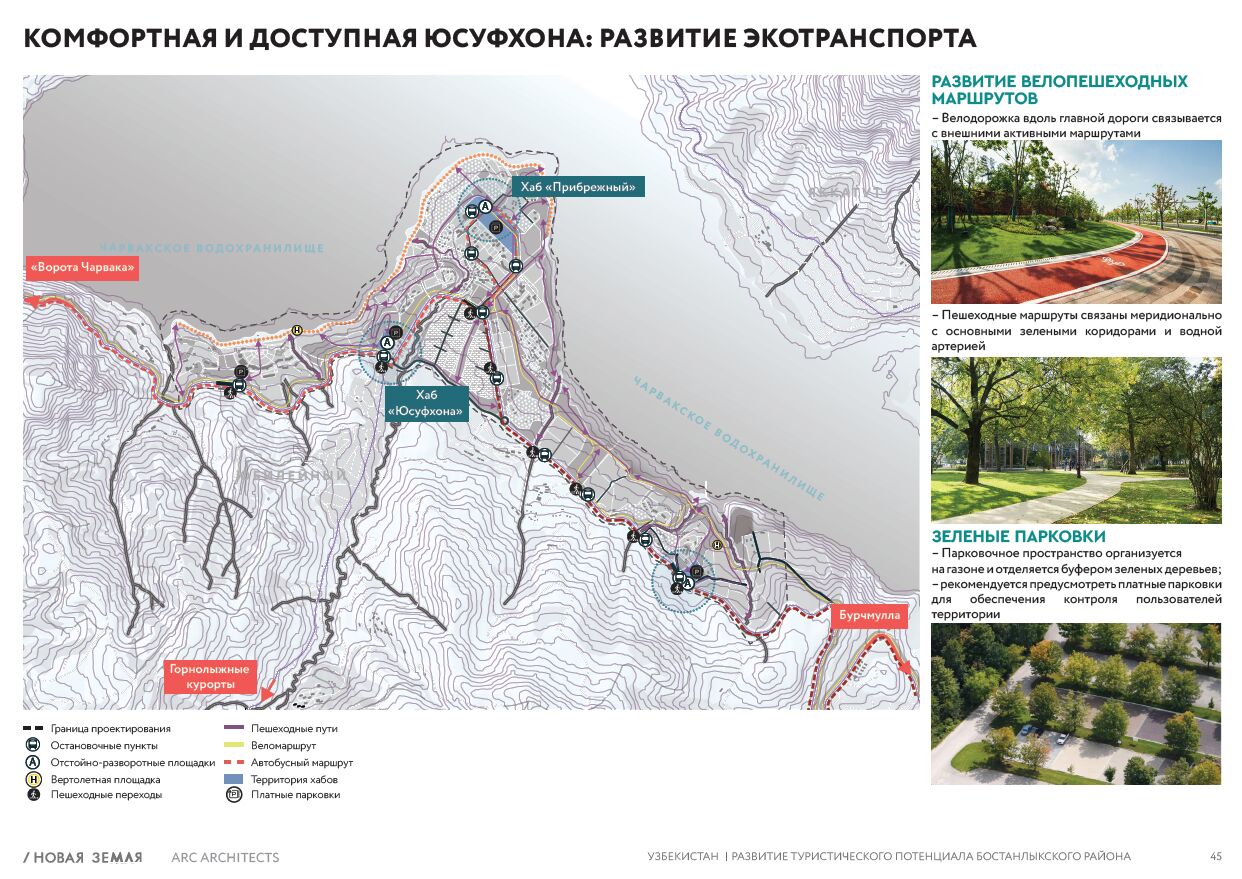 «При создании архитектурных решений проектной территорий «Ворот Чарвака» мы, прежде всего, руководствовались тем, чтобы отразить культурно-исторические элементы традиционной горной архитектуры нашего региона, а именно уважению к природе и натуральному рельефу горной местности, традиционная отделка с использованием натуральных материалов, таких как камень, дерево, саманная штукатурка. Таким образом, основная идея – воссоздать образ традиционного горного поселка с плотной застройкой, ограниченной этажностью с использованием айванов и террас. Территория «Юсуфхоны» будет иметь более современный облик, но обязательным является уважение к природе и натуральному рельефу», - рассказал автор архитектурных решений проекта и руководитель архитектурного бюро ARC Бобир Кличев.