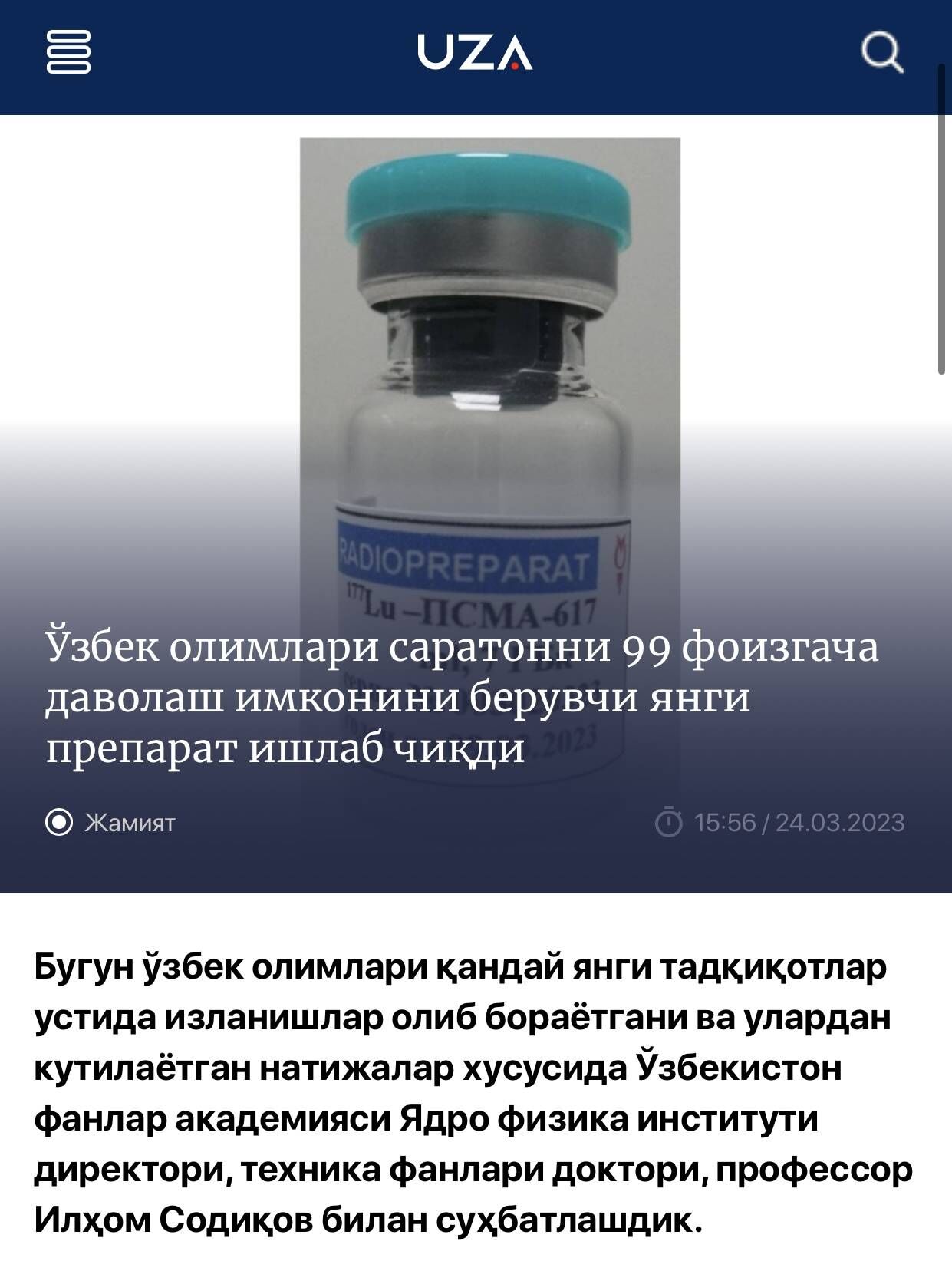 Ранее Директор Института ядерной физики Академии наук Узбекистана, доктор технических наук, профессор Ильхом Садыков в интервью УзА сообщил, что узбекские учёные зарегистрировали и запустили в производство препарат «Лютеций - 177», эффективный при лечении рака на 99%.