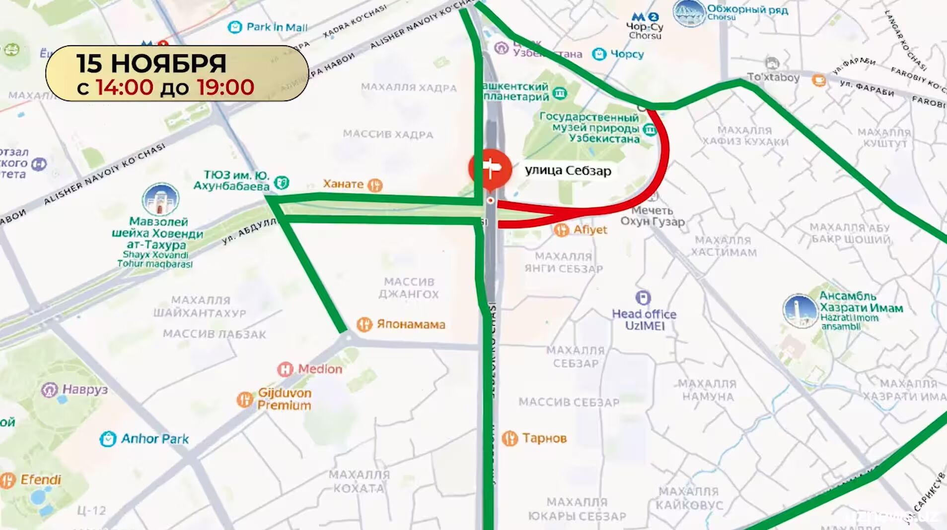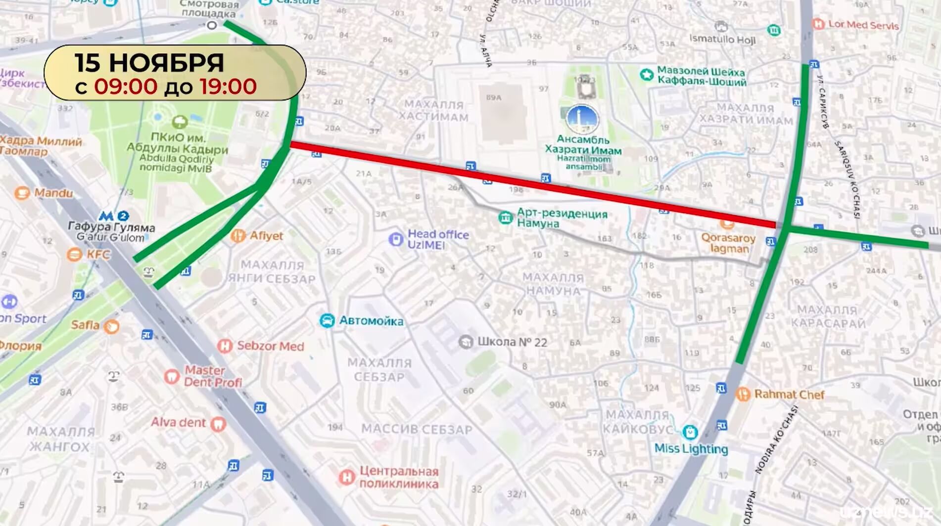 15 ноябрь куни соат 14:00 дан 19:00 гача Абдулла Қодирий кўчаси ва "Ганги" кўприги кесишмасидан Абдулла Қодирий, Қорасарой ва Зарқайнар кўчалари чорраҳасигача бўлган қисм ёпилади.