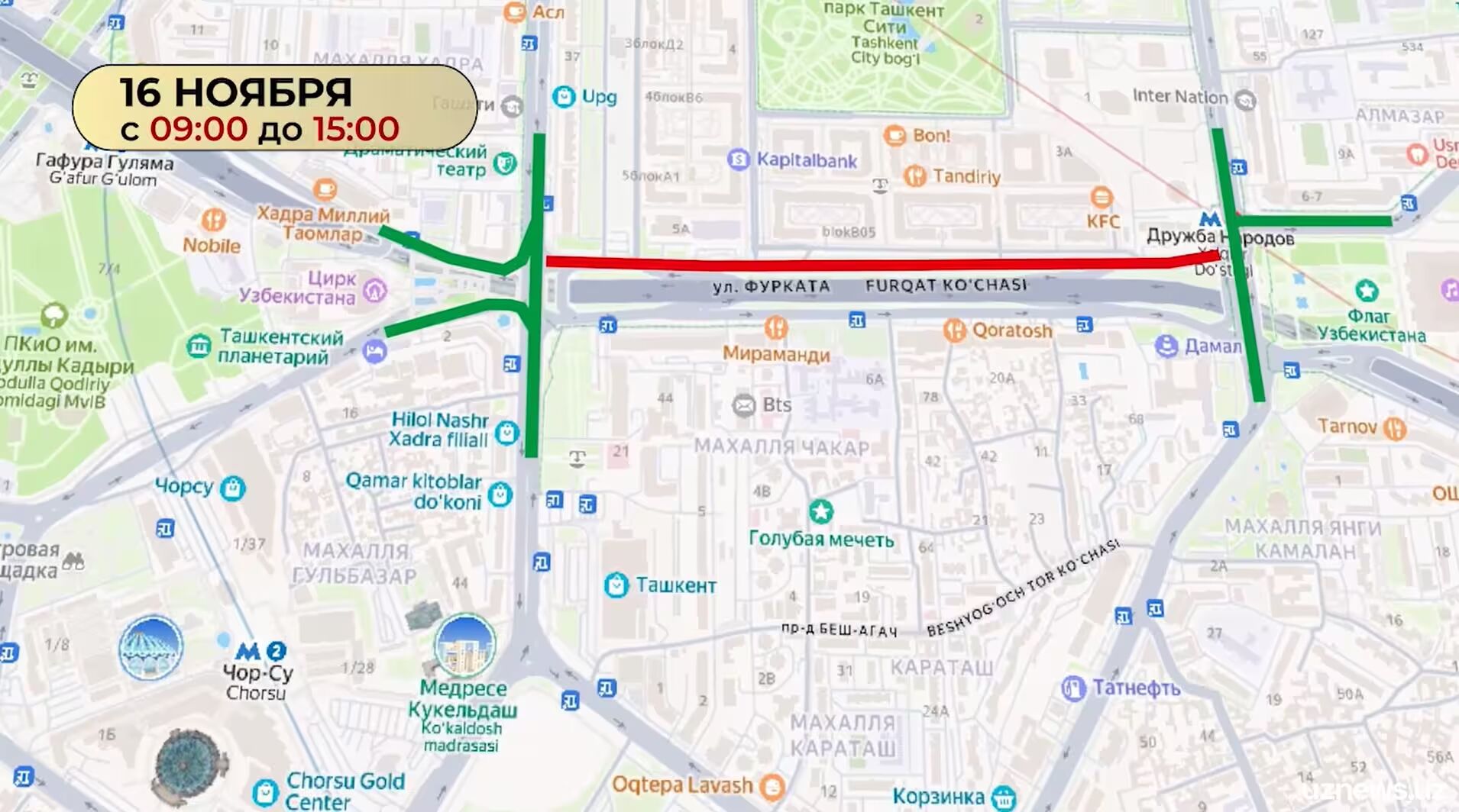 16 ноябрь куни соат 09:00 дан 15:00 гача Ислом Каримов ва Фурқат кўчалари кесишмасидан Хадра майдонигача Фурқат кўчаси иккинчи даражали йўл бўйлаб ёпилади.