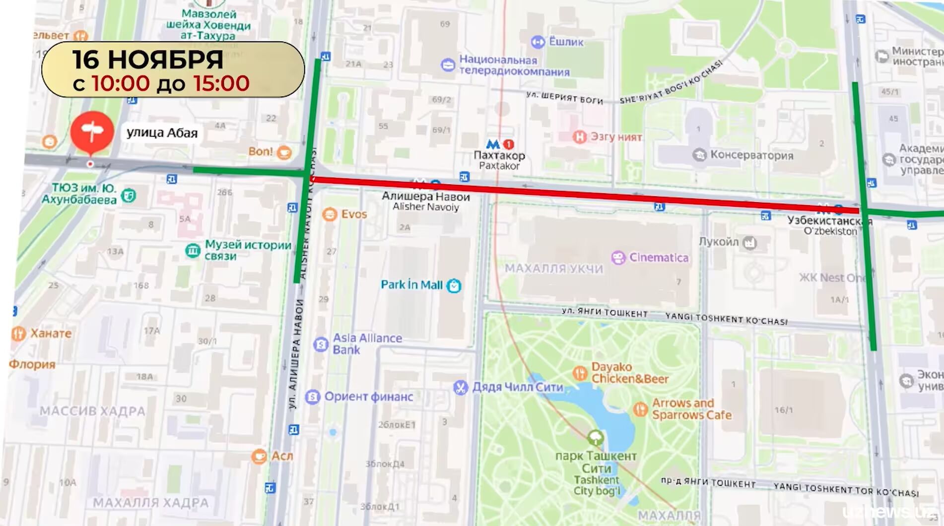 16 ноябрь куни соат 10:00 дан 15:00 гача Ислом Каримов ва Ботир Зокиров кўчалари кесишмасидан Ислом Каримов кўчаси бўйлаб Ислом Каримов ва Фурқат кўчалари кесишмасигача бўлган қисм вақти-вақти билан қисман ёпилади.