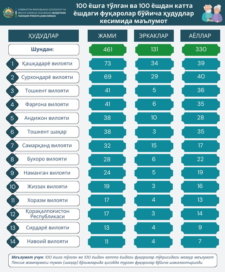 2025 йил 1 декабрь ҳолатига, Пенсия жамғармаси ҳисобида туриб пенсия олаётган 100 ёшга тўлган ва 100 ёшдан катта ёшдагилар сони 461 нафарни ташкил қилмоқда.