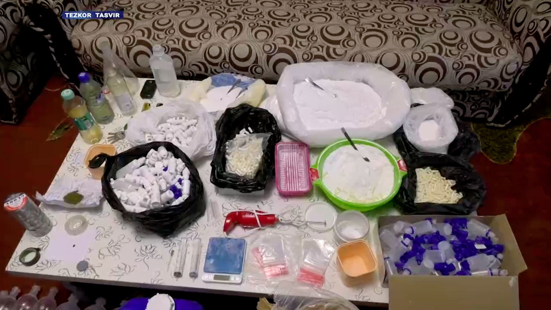 Тезкор тадбир давомида ушбу манзилдан умумий қиймати 4,5 млрд сўмга тенг бўлган 3,5 кг “Прегабалин” кучли таъсир қилувчи моддаси, 20 литр суюқ ва 25 кг кукун кўринишидаги прекурсорлар, шунингдек, уларни тайёрлаш ва қадоқлашда фойдаланиладиган анжомлар ашёвий далил сифатида расмийлаштириб олинди.